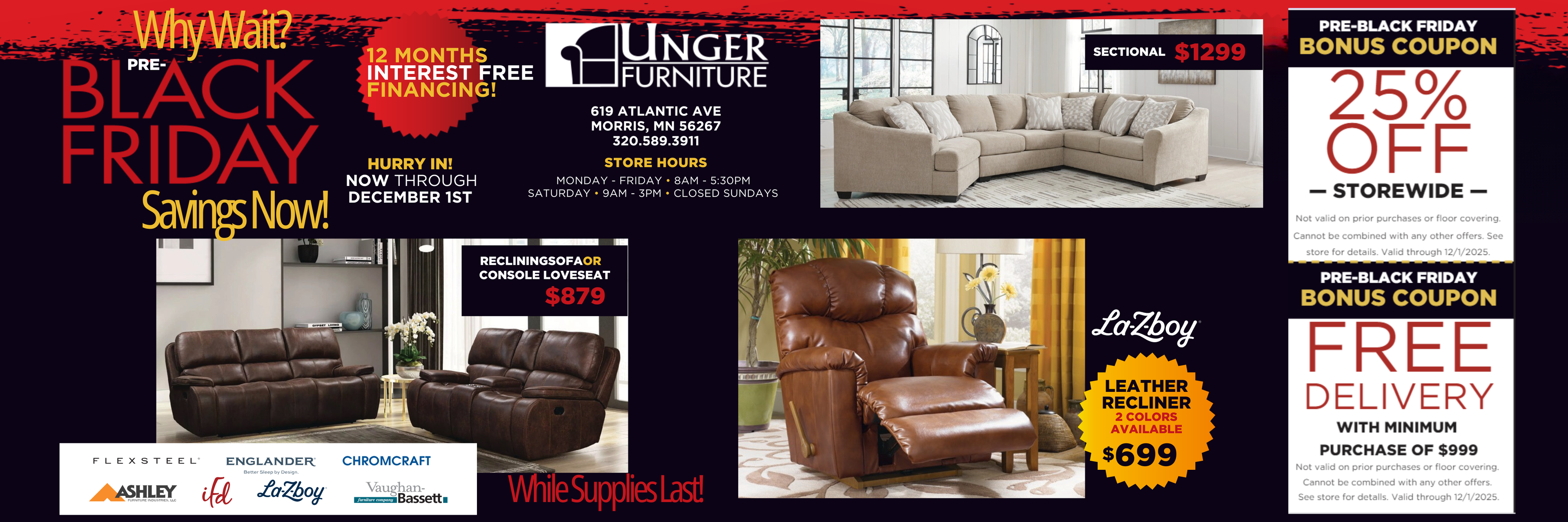 For over 100 years, Unger Furniture has been a trusted part of life in Morris, Minnesota. Family-owned and rooted in small-town charm, we offer a no-pressure, personalized shopping experience. With friendly service and free local delivery, we make finding the perfect piece feel like home.