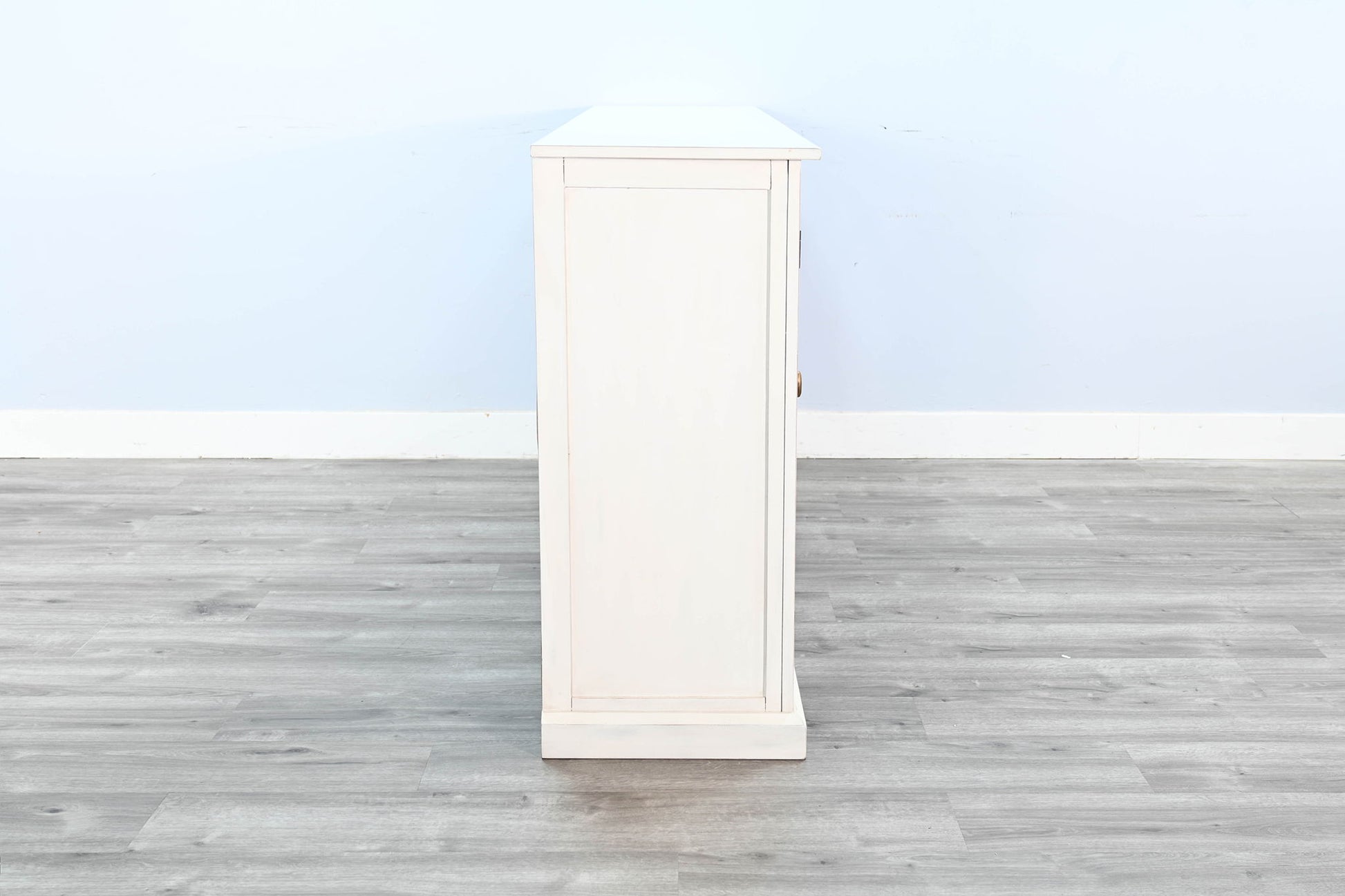 Crafted with precision using Mahogany wood, this console boasts the captivating two-tone design that defines the collection. With its perfect blend of classic and contemporary aesthetics, the console features glass cabinets and rustic hardware, elevating the overall sophistication. The intricate wood design on the glass doors adds a unique touch, while the ample storage within offers organized space for your media essentials.