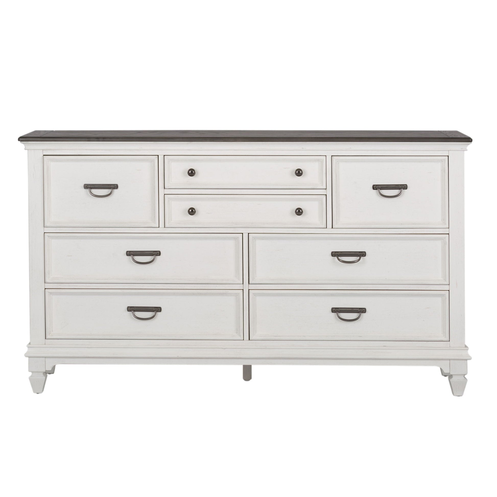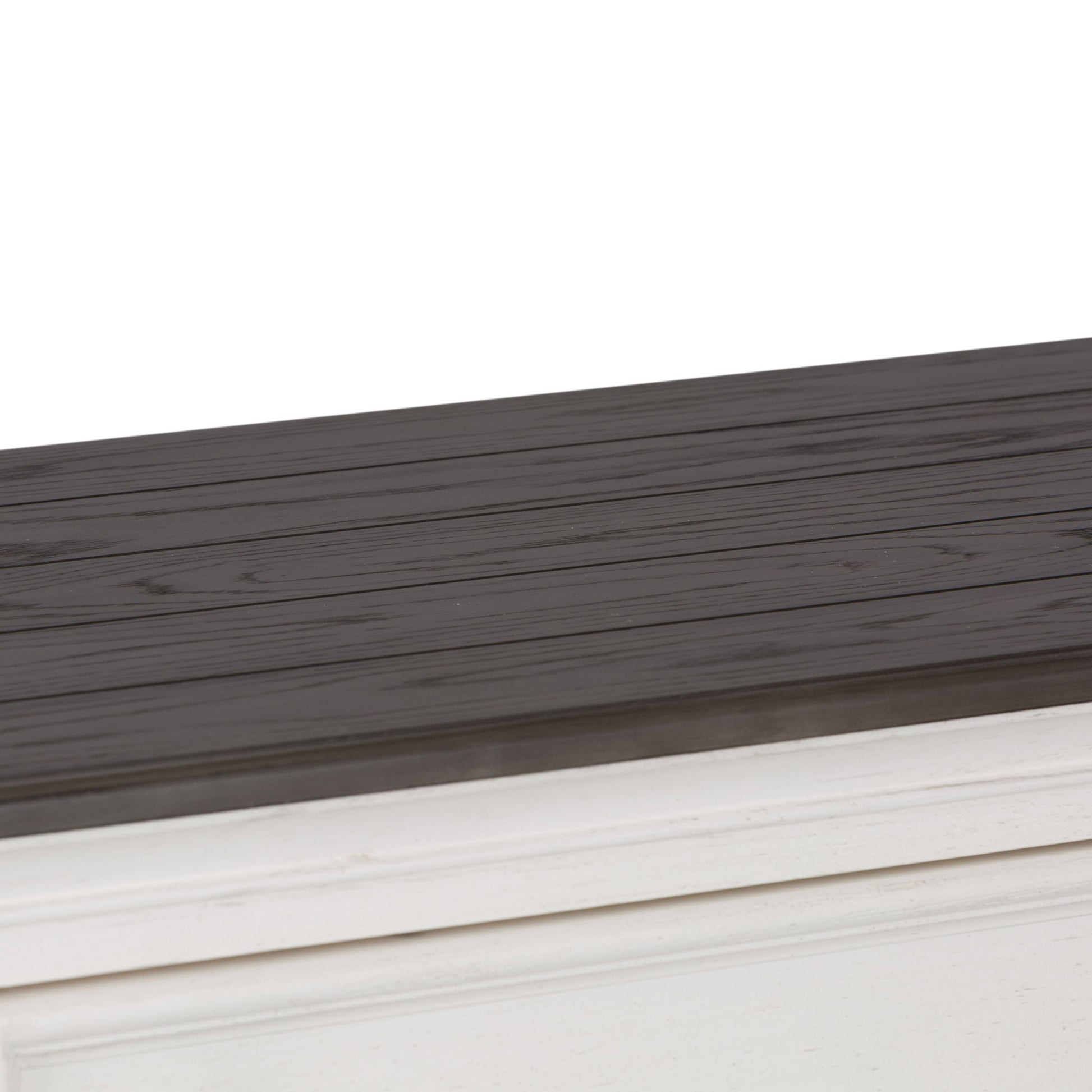 The two-toned wire brushed white finish with charcoal top adds a taste of vintage, allowing this piece to work from the mountains to an industrial loft. The charcoal top is accented by planks while the white base is highlighted by bead molding and antique pewter hardware. Crafted of rubberwood solids with cathedral white oak tops, this piece features fully stained interior drawers, full extension drawer glides for easy access to storage, felt lined top drawers, and is anchored by tapered feet. Style uncompromised with storage abound, enjoy the ample drawer storage, each equipped with bottom case dust proofing.