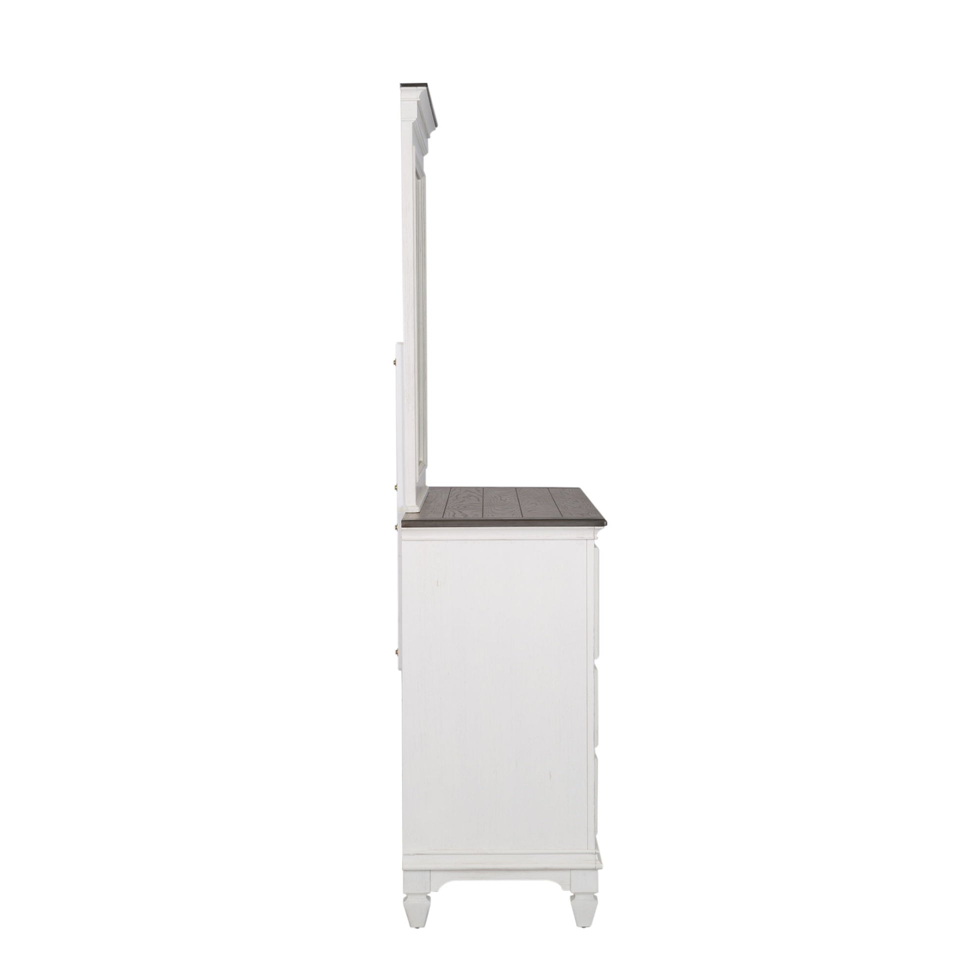 Design possibilities are endless with the Allyson Park dresser and mirror. Crafted of pine solids with cathedral oak tops, this piece features a wire-brushed forest finish. The dresser has eight wood framed full extension drawers of varying sizes, all of which offer plenty of deep storage. The top drawers have felt lining. The bead molding, square tapered feet. Attach the crown mirror with a beveled edge with the included bolt-on supports. Allyson Park offers cottage styles you love in a wire brushed two tone finish that will work from the beach to the mountains to an industrial loft.