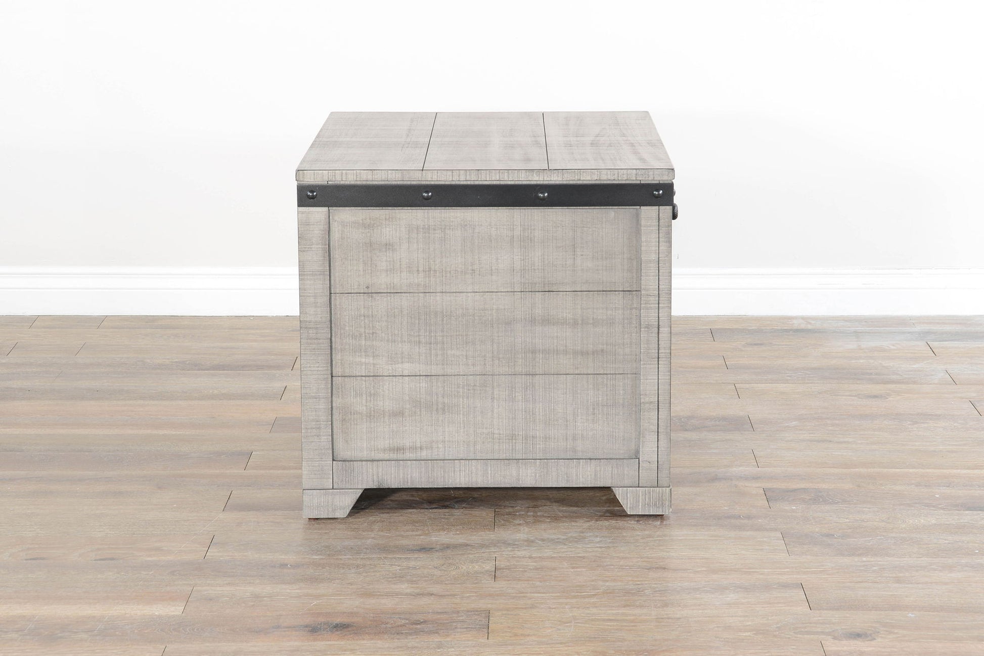 Versatile and stylish addition to your living space that seamlessly combines form and function. Crafted with care, this table features distressed mahogany with slated panel sides, exuding a rustic charm that adds character to any room. The inclusion of metal details provides an industrial touch, elevating the overall aesthetic with a hint of modern edge.