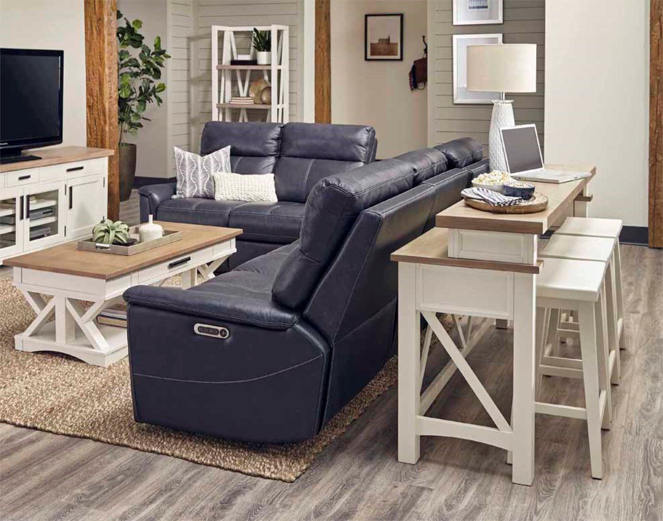 Destined to be the heart of any conversation area, the Americana Modern Cocktail Table is a must-have. Crafted in a soft finish, it features a contrasting wood-grain top in Weathered Natural. A lower open area is perfect for storage and display while a center drawer and crossbeam design touches give it endless appeal.