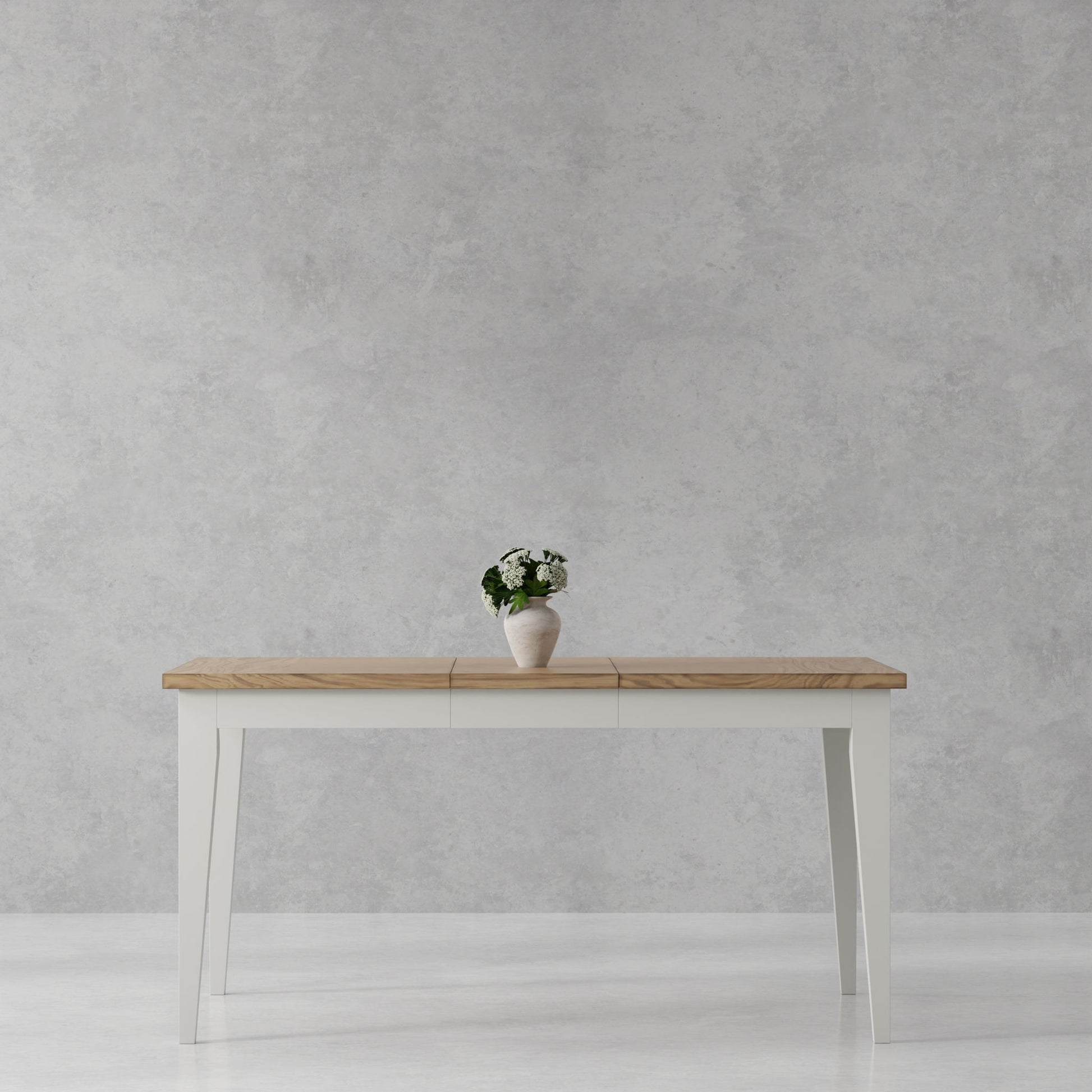 The 60-inch rectangular dining table is a stunning addition to any home. Its fresh hand-painted Cotton finish and contrasting Weathered Natural top offer timeless charm that is sure to impress. The expandable table top accommodates groups of varying sizes, seating up to 6 comfortably and up to 8 with the included 18-inch leaf. The two Captain's drawers are a practical feature that provides ample storage space for dining and entertaining essentials. with dovetail joinery and ball bearing glides, these drawers are both functional and durable. The fashionable apron of the table reflects vintage influences, while the solid-metal custom hardware in authentic Burnished Bronze adds a touch of elegance. The tapered legs create and eye-catching silhouette. Made with Poplar solids and Birch veneers, this table is built to last.