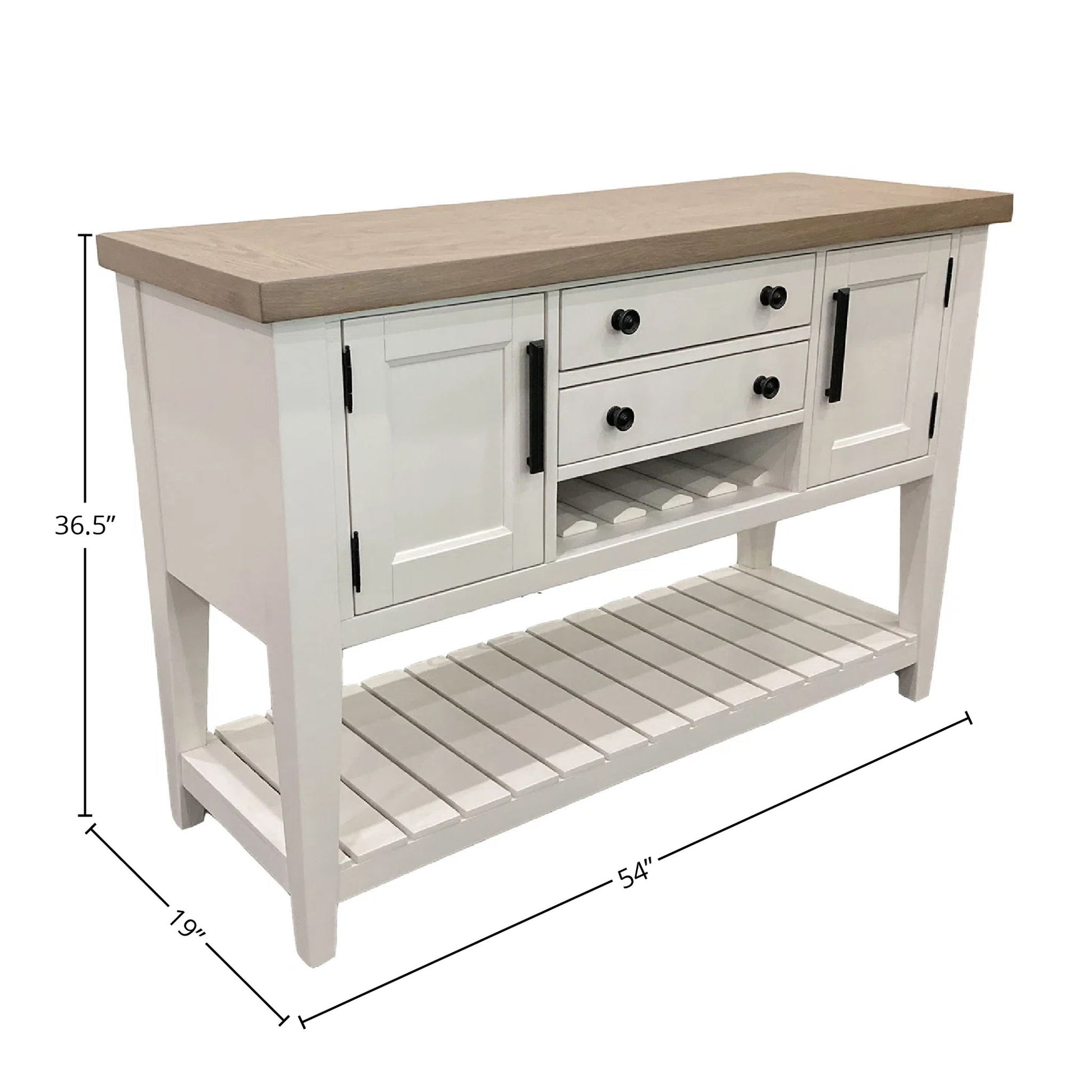 Elevate your dining and entertaining space with the 54 inch sideboard. This stunning piece features a fresh hand-painted Cotton finish with a contrasting Weathered Natural top that offers timeless charm. The solid-metal custom hardware in authentic Burnished Bronze adds a touch of sophistication to this piece. The integrated, Dual AC Power Center makes it easy to keep electric appliances close at hand, making it a practical addition to your space. The two storage drawers, perfect for dining and entertaining essentials, are equipped with ball bearings for smooth opening and closing. The English dovetail joinery gives the drawers added strength and durability. The open, slatted bottom shelf provides flexible storage options, while the built-in storage rack elegantly displays wine bottles. With its timeless multifunctional design, this sideboard adds style, storage and display to any space. The concealed storage behind doors and drawers keeps clutter out of sight, making it a versatile piece for any room.
