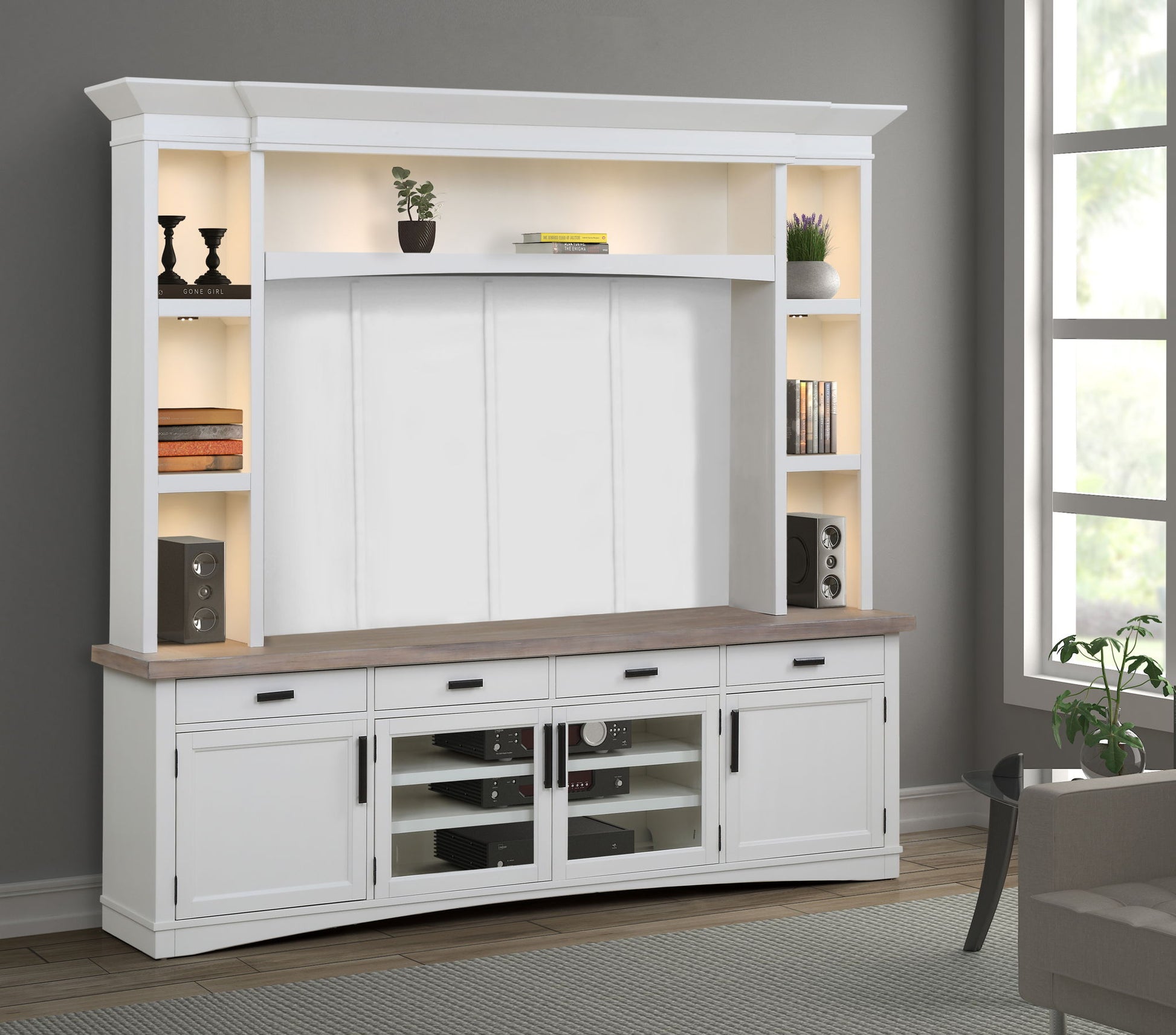 Surround your television and components in classic style with this 92-inch TV Console with Hutch and back panel. Simple yet elegant, its classic silhouette is finished in a soft, with a contrasting wood-grain top in Weathered Natural. Part of the Americana Modern collection, this multifunctional media solution features adjustable wood shelves, storage drawers and compartments, 3-way LED touch-lighting, glass doors with wood trim, and cord management.