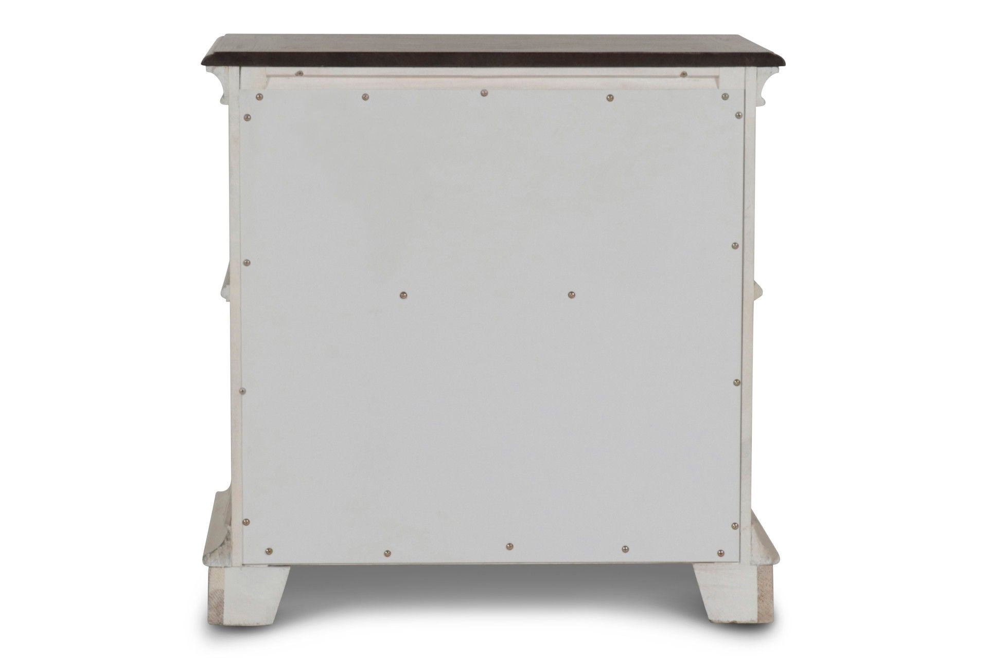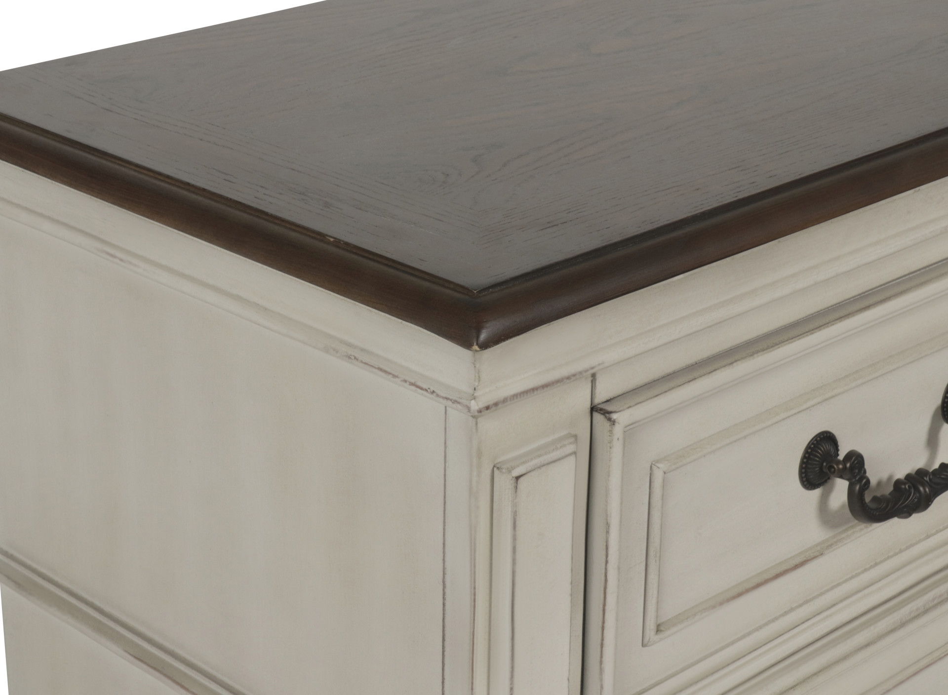 - Vintage French Country Cottage Charm: A creamy off-white stain is enhanced with brown and gray burnishing to highlight the moldings, drawer faces and hand distressing. The rustic brown finish top completes the antique, old world charm look.