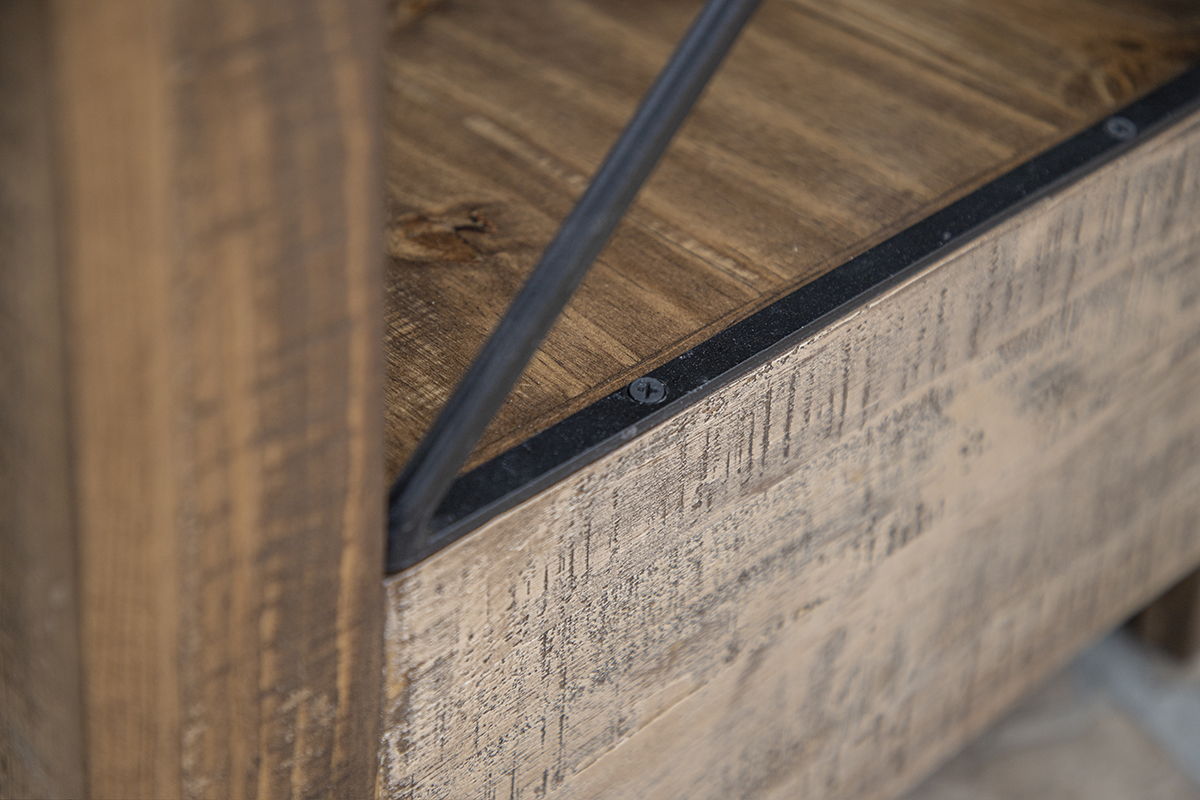 3 Shelves 1 Drawer Bookcase. Introducing Andaluz, crafted from solid pine wood, this collection brings a unique addition to your space. With its three-shade finish complemented by wrought iron "X" sides, Andaluz effortlessly infuses a modern rustic touch into any setting.
