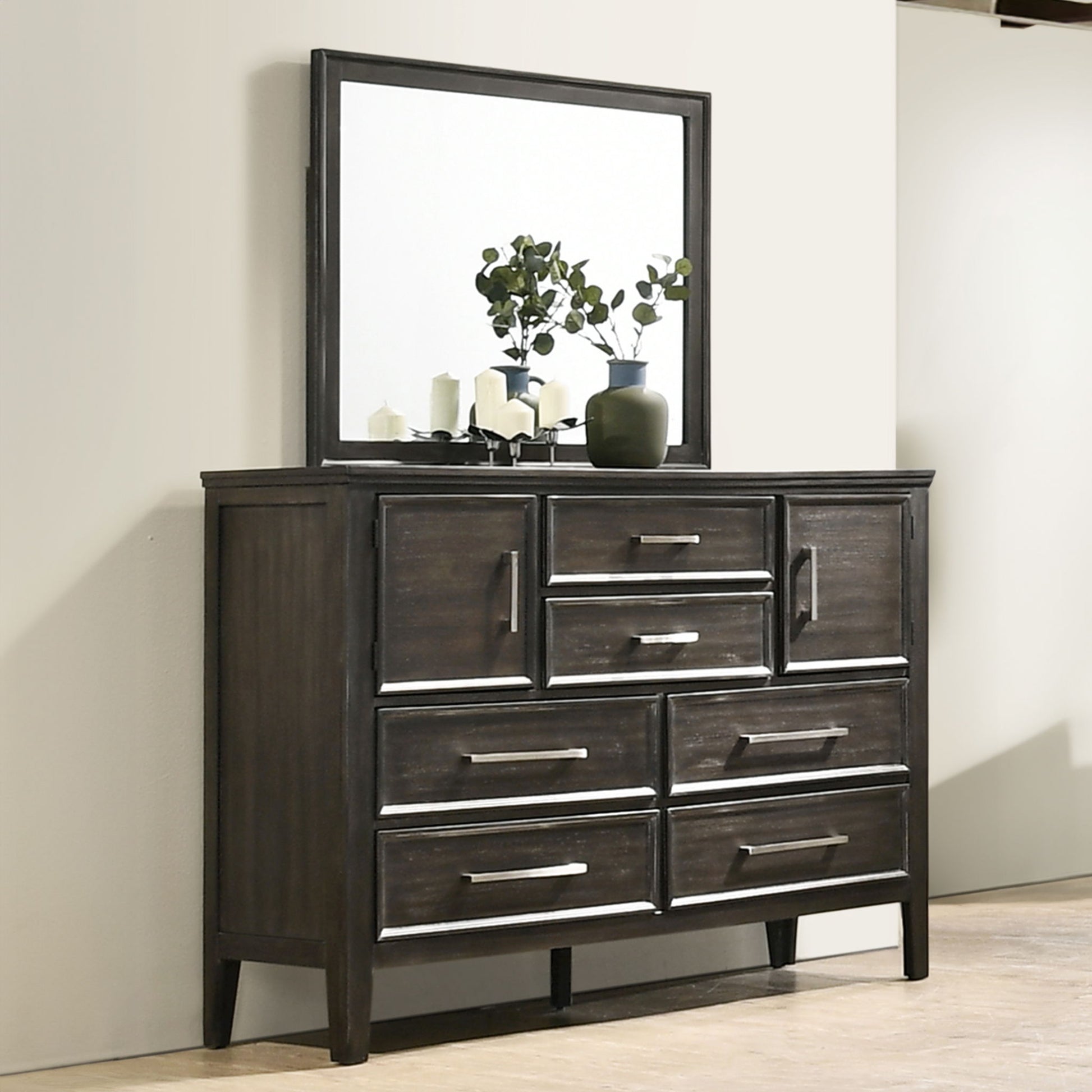 The Andover 2-Piece Wood Dresser and Mirror Set offers a blend of durability, style, and functionality, making it an ideal addition to any bedroom. This set includes a dresser and a matching mirror, both expertly crafted from solid Rubberwood, manufactured woods, and wood veneers, ensuring long-lasting durability while showcasing the natural beauty of real wood. The rich Nutmeg Brown finish is achieved through a meticulous multi-step process, featuring sand-throughs and white glazing, which imparts a sophisticated, weathered appeal, highlighting the unique grains and characteristics of the wood. The Andover collection’s clean lines and modern rustic style are complemented by sleek, elongated metallic handles that provide a sophisticated contrast to the warm, dark wood finish. The framed drawer fronts add depth and dimension, while the sturdy block-style legs ensure a solid and stable foundation. The drawers glide smoothly on robust Kenlin drawer glides and feature dovetail joinery, a testament to superior craftsmanship. The set is completed by the pristine, low-distortion beveled glass mirror, encased in picture frame-style moldings that offer a clean, elegant look, enhancing any space with timeless sophistication.