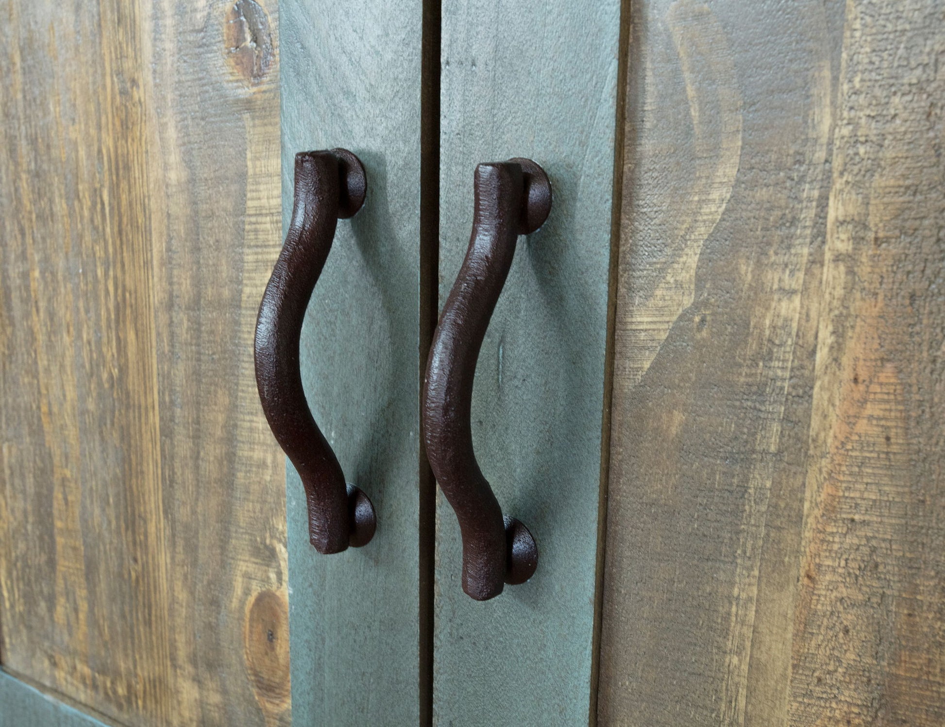 - Hand-wrought iron pulls with non-chip finish in matte black.