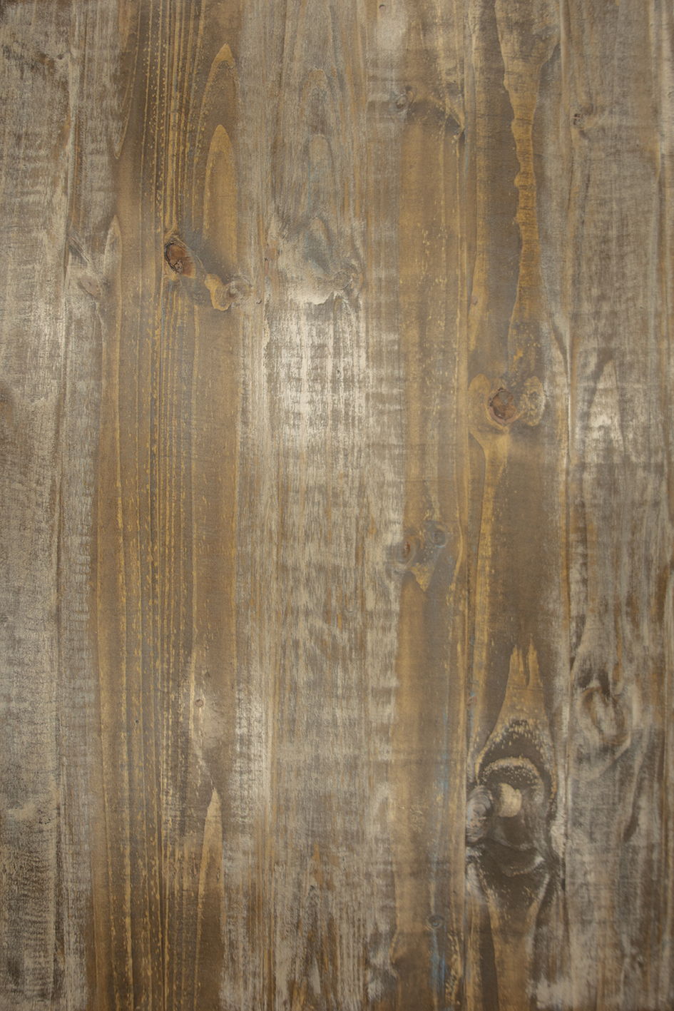 - A multi-step, soft, multi-colored finish on hand-distressed wood.