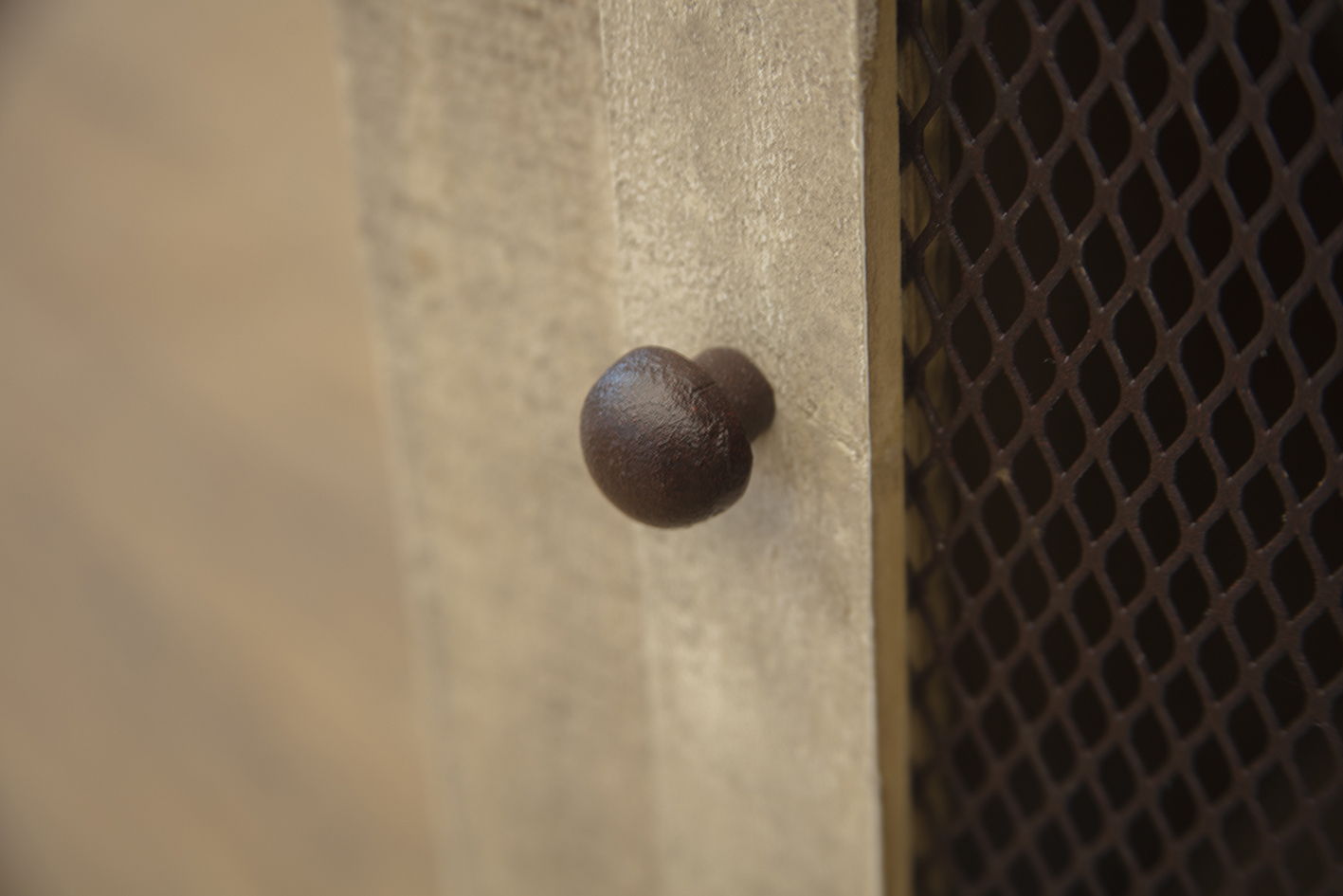 - Sliding barn-style doors with Iron mesh on door panels offer convenience and rustic appeal.