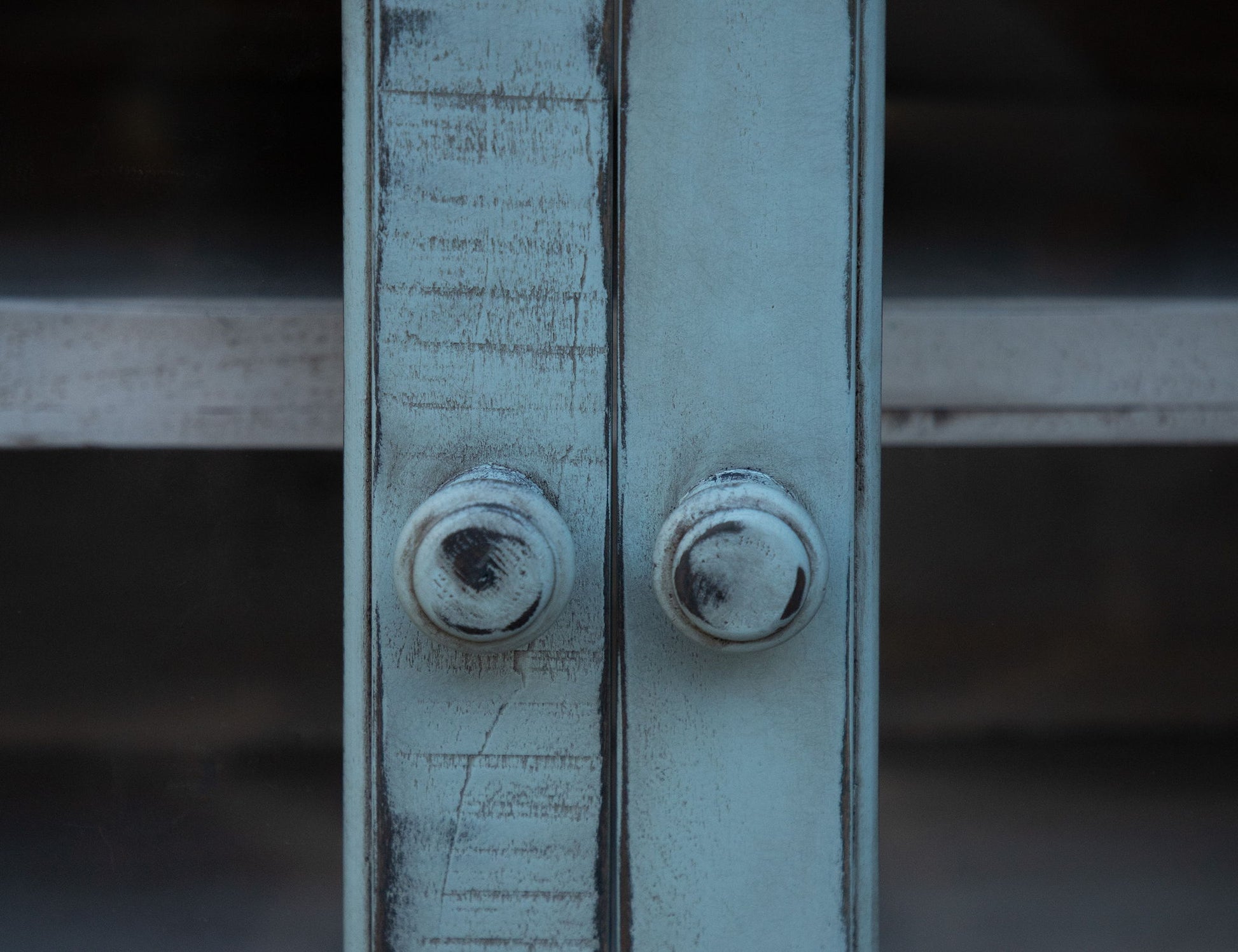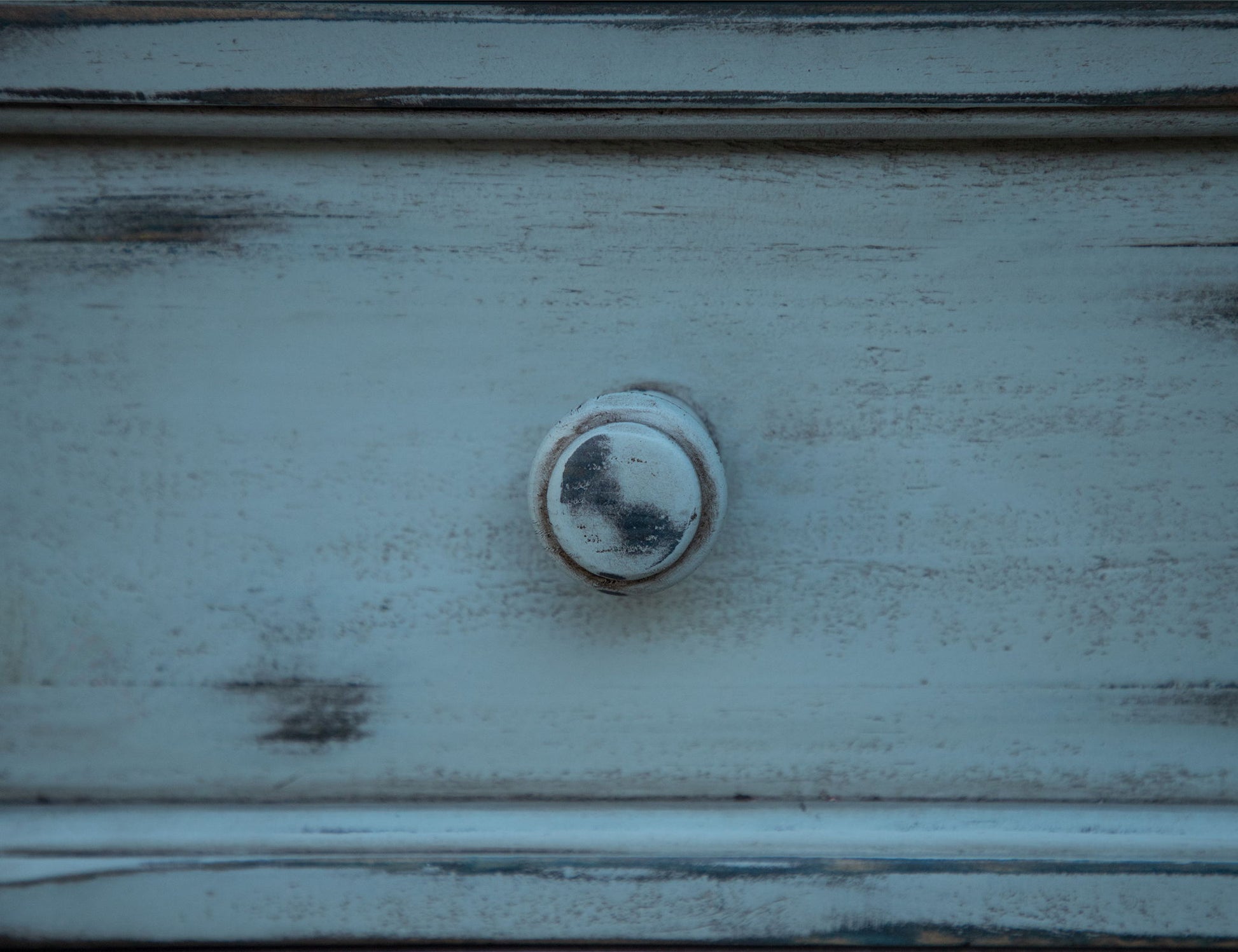- A white antiqued finish is applied using a hand-rubbed technique in a multi-step process. Doors and drawers feature a sky blue tone.