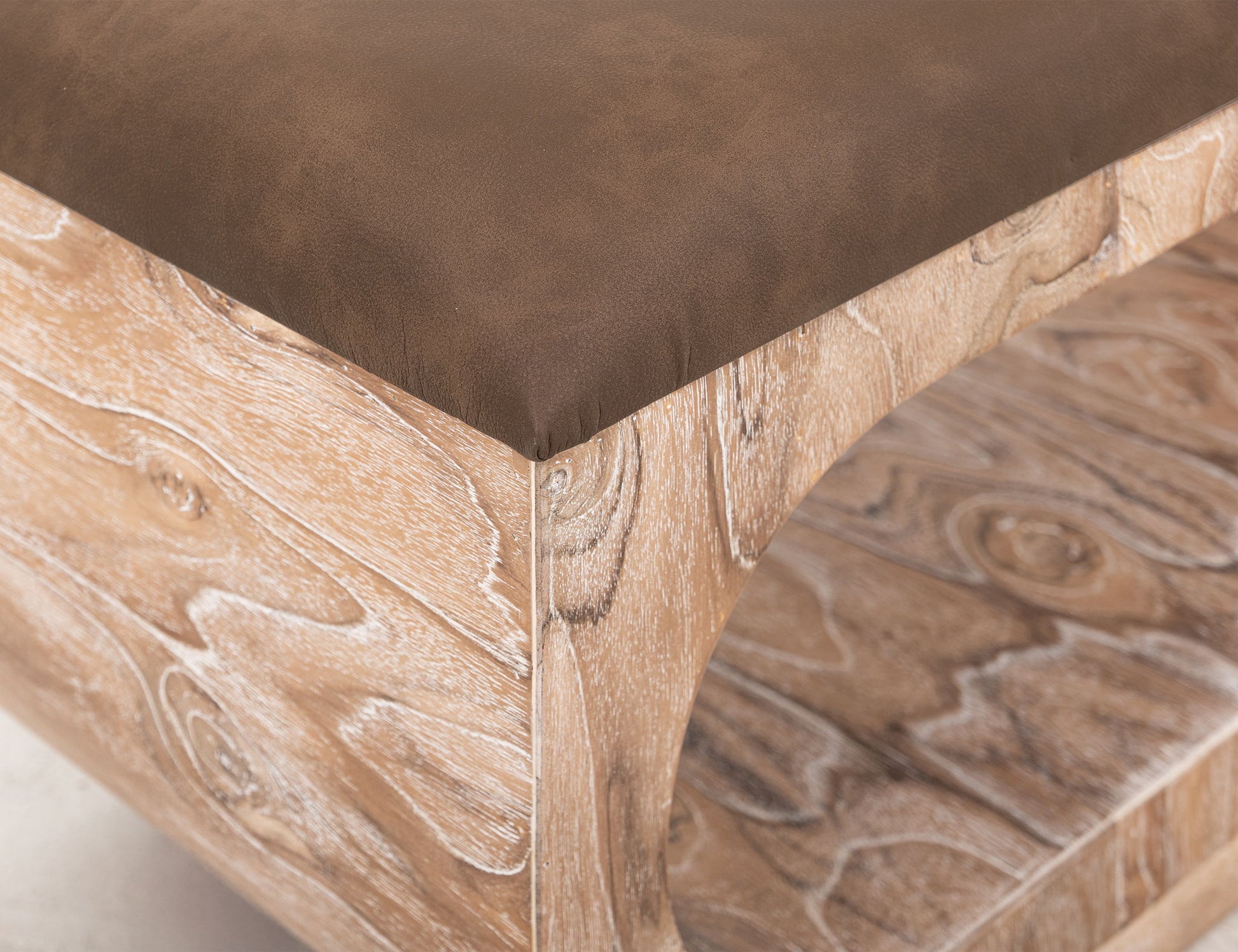 Upholstered Seat Bench with Two Open Shelves. The Balam bench is a beautifully crafted piece made from sustainable mango and engineered teak wood. Its elegant design blends organic warmth with modern sophistication, making it a perfect addition to any space. The bench features a comfortable cushioned seat with gently rounded corners and an open storage compartment for books, blankets, or decorative items. Ideal for an entryway, bedroom or reading nook, the Balam bench adds effortless charm to any setting.