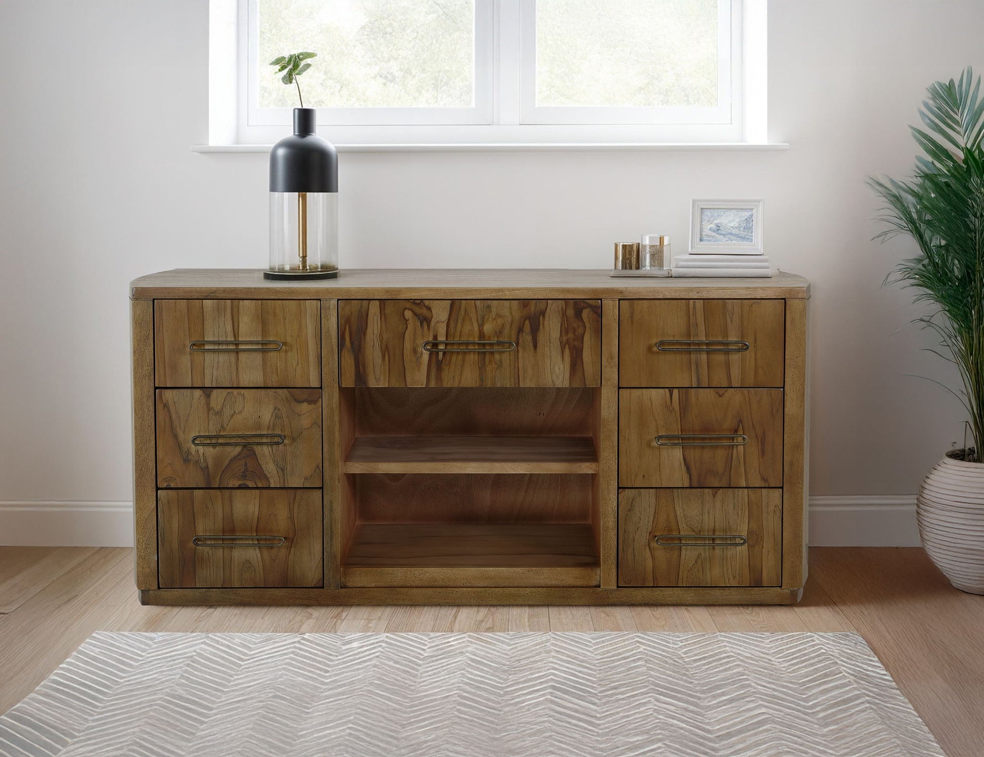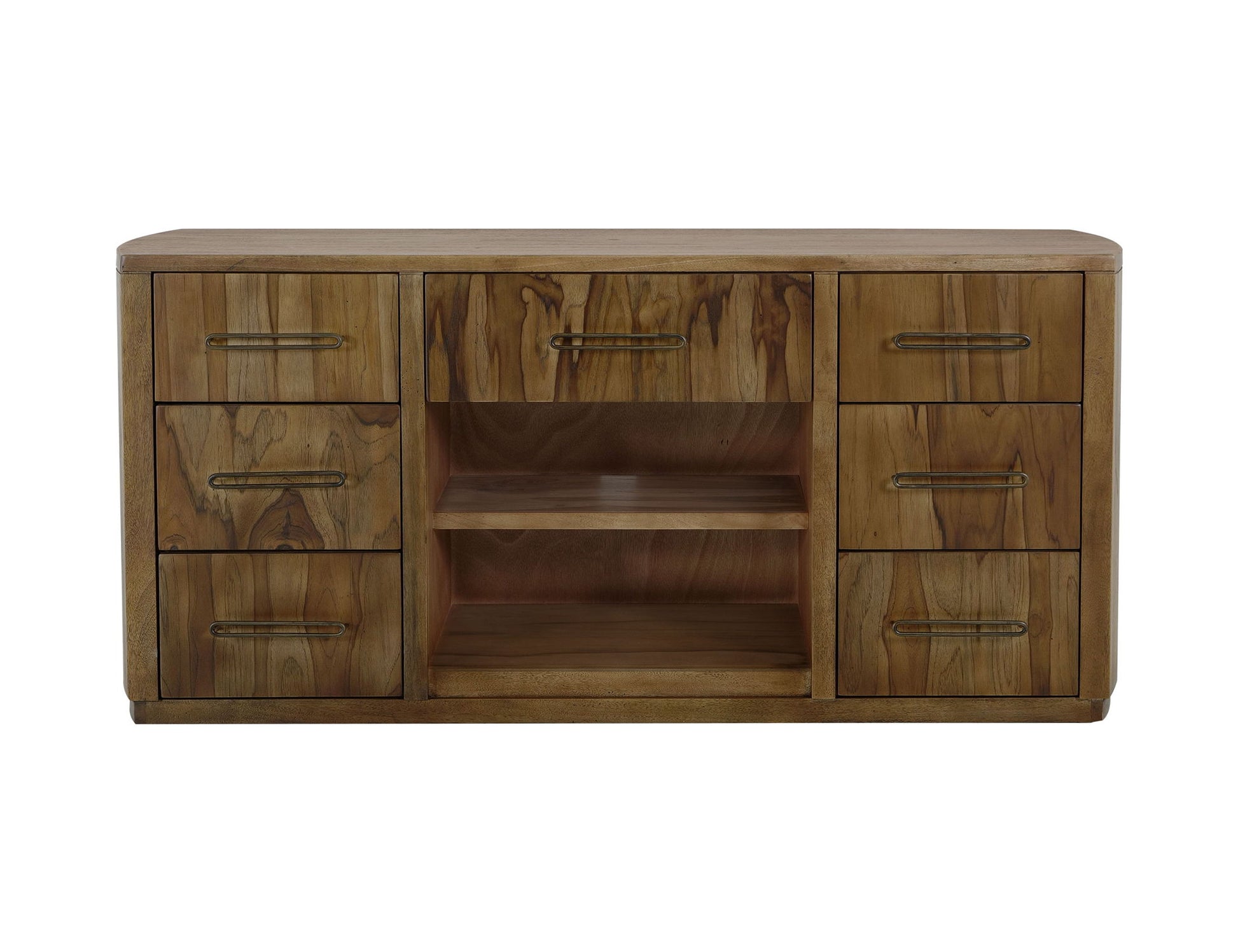 7 drawer, 1 Shelf, Console. Our Balam collection is handcrafted from mango and teak wood. This simple yet stunning collection will bring an organic, modern touch to your space. The Balam consoles highlight the wood's unique grain and offer ample storage for your essentials, adding a stylish look to any room. They are ideal for bedrooms, living rooms, or any area that needs organized storage. The Balam collection not only improves your home but also highlights skilled craftsmanship. Transform your space with these practical and attractive pieces.