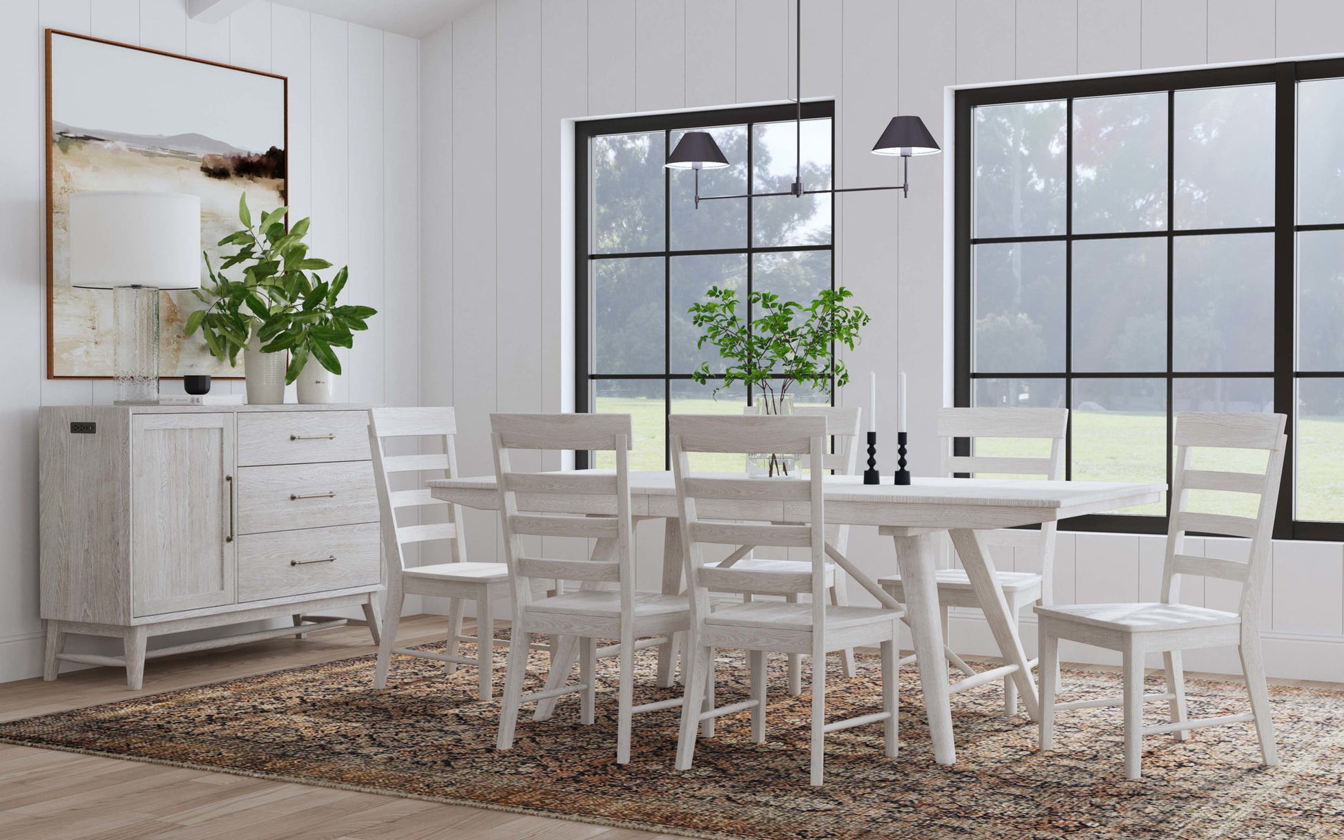 The Bayside Dining Collection offers simple lines, timeless modern style, designed to fit today’s contemporary homes. Constructed of Solid Ash and Ash Veneer. Available in two classic finishes – Black or White. The unique bar pull hardware has a light, distressed bronze finish.