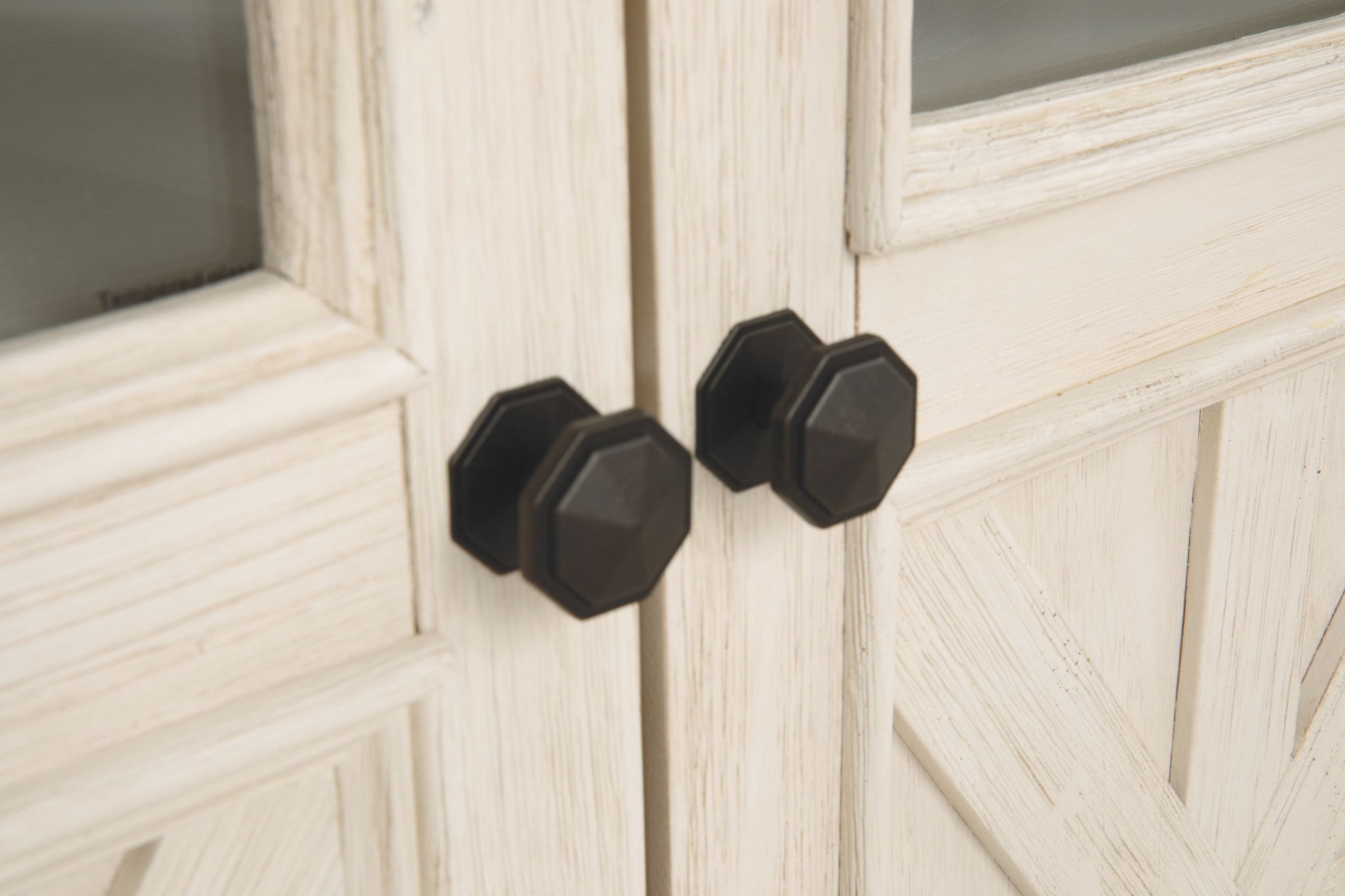 Whether your style is farmhouse fresh, shabby chic or country cottage, you’ll find this medium TV stand perfectly in tune. Its two-tone finish pairs a trendy textured antique white with a weathered gray for that much more quaint character. Charming elements include crossbuck adorned cabinet doors with glass inlays for peek-through flair. Ample adjustable shelving and cutouts for wire management nicely accommodate your media needs.