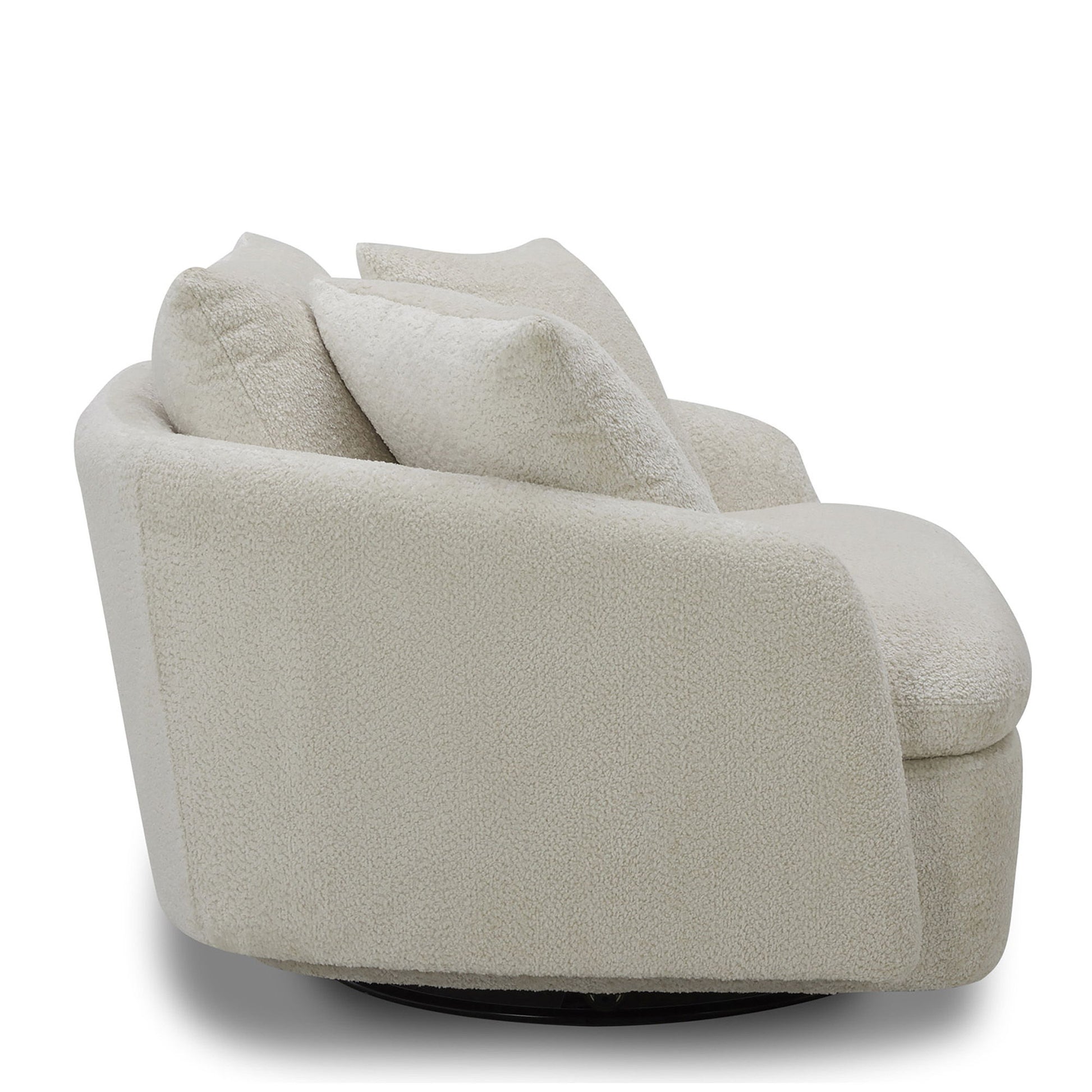 Dreamy comfort awaits with the Boomer oversized swivel chair. Comfy and cozy, its generous proportions are ideal for snuggling and nestling deep for relaxation. Its rounded silhouette has low arms and is complemented by a back pillow and two comfort pillows. Boomer has a 360-degree swivel base so you can face any direction and is available in luxuriously textured fabric options.