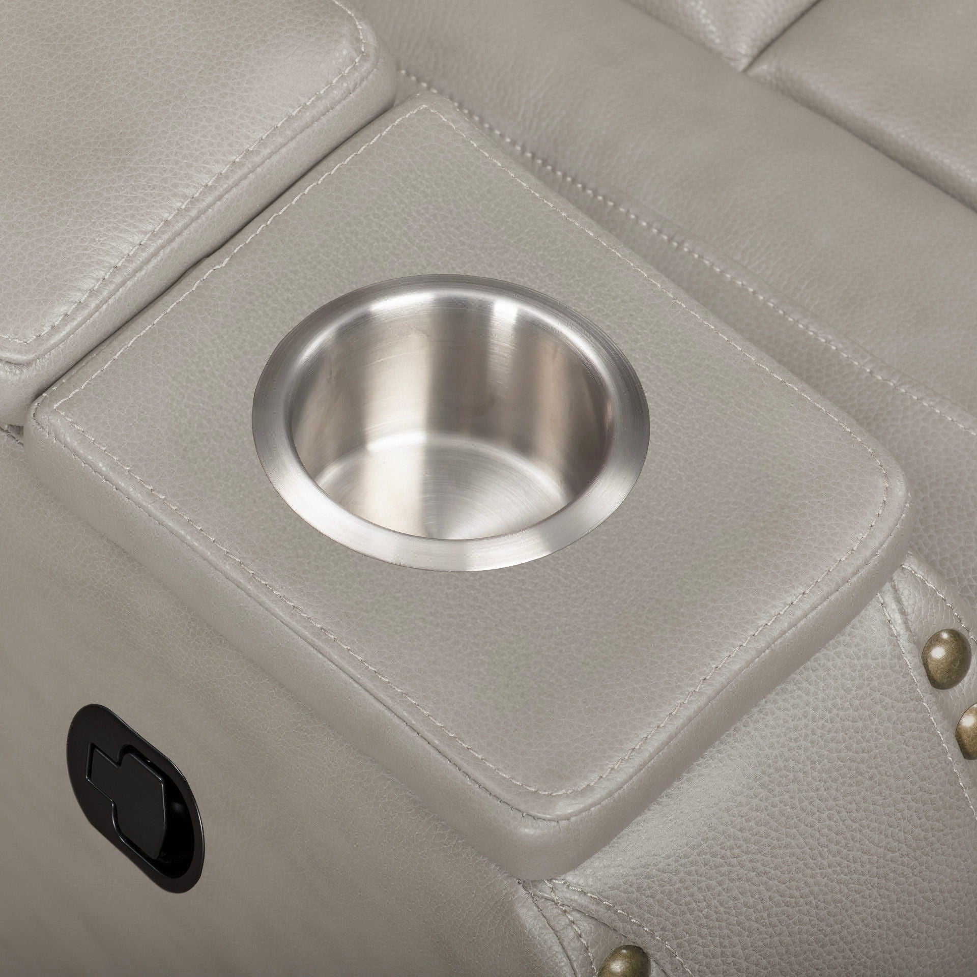 The Breckenridge Genuine Leather Reclining Sofa offers a perfect combination of luxury, durability, and modern convenience, making it an ideal centerpiece for your living space. This reclining sofa is crafted with a blend of hardwood and manufactured woods, ensuring a sturdy and durable frame that provides long-lasting support and reliability. The top-grain leather on the seats, arms, and footrests delivers a luxurious feel, while a matching leather-like material in less-touched areas keeps it affordable without compromising on style or comfort. The design features clean lines and elegant nailhead trim, blending traditional and contemporary elements for a refined, transitional look. Pocket coil seat cushions provide superior comfort with targeted support, minimizing pressure points for a tailored seating experience. The reclining seats allow you to easily find your perfect position for lounging or reading. This sofa is also packed with convenient features, including cupholders integrated into the armrests. Additionally, the sofa includes a drop-down tray, electrical outlets, and reading lights, making it a functional and stylish addition to any home.
