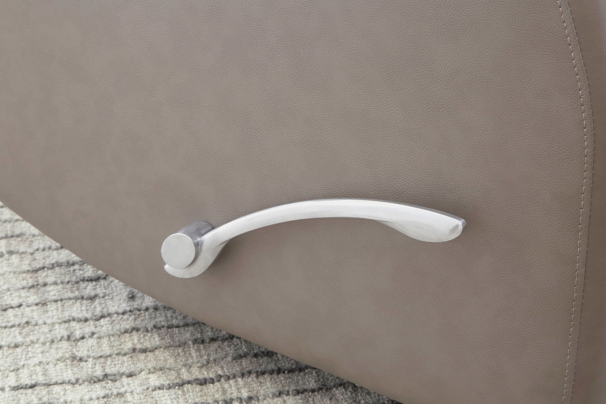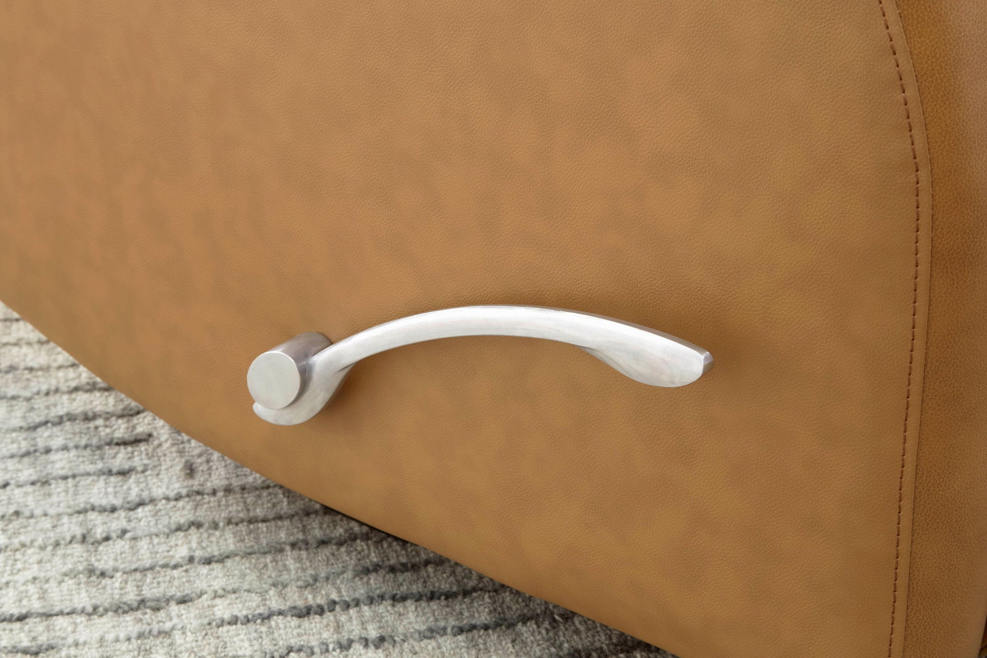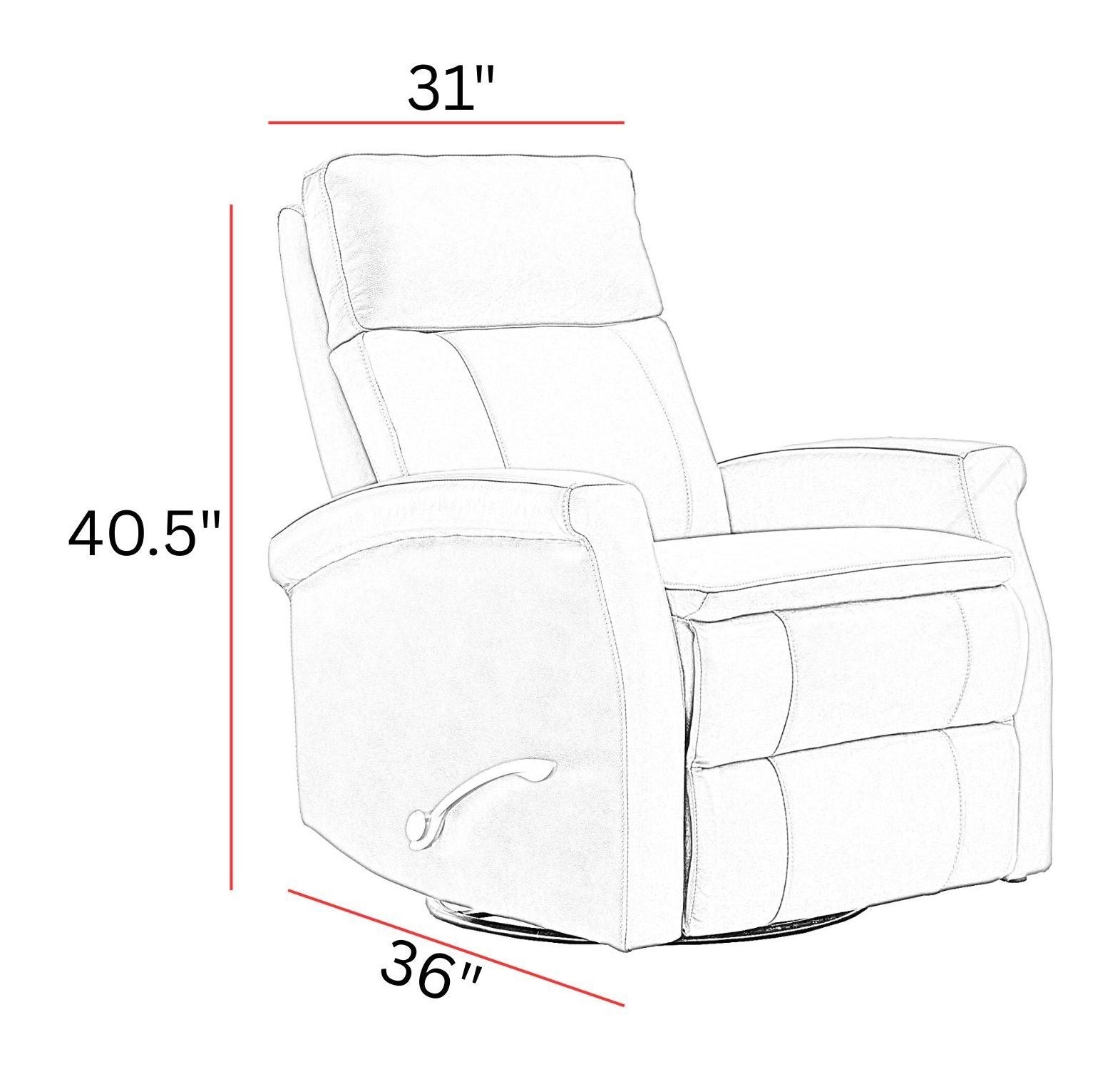 The Bristol swivel glider recliner is stylish and functional for any living space. It features a transitional key arm, a nickel-finished handle, and an easy-to-use reclining feature. Bristol is covered in soft leather, swivels 360 degrees, and is made using sustainably sourced woods in a solar-powered facility, ensuring quality and environmental responsibility.