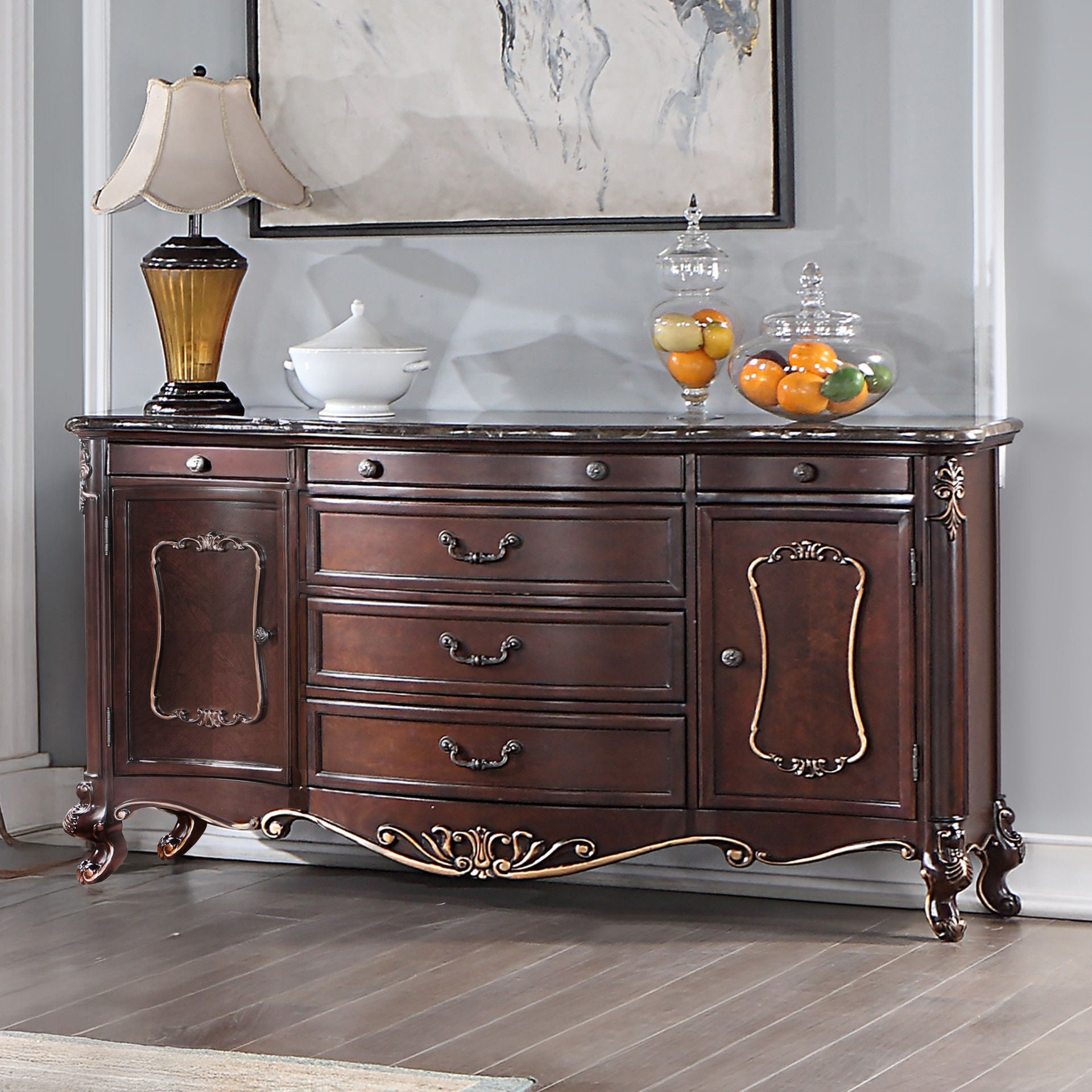 The Royal Classics Constantine Sideboard / Server in cherry combines heirloom craftsmanship with functional elegance, making it a refined addition to any dining room. Expertly crafted from solid pine and premium fancy face birch veneers, this piece ensures lasting beauty and durability. The multi-step finish enhances the natural wood grain, while delicately burnished gold tipping highlights the intricate carvings, adding a touch of luxury to its design. Inspired by 18th-century Rococo style, the sideboard features ornate ornamentation and carvings that bring a sense of regal sophistication to your home. The genuine marble top follows the furniture's graceful curves, while bowfront drawers and cabriole legs complete its lavish look. For practical use, the sideboard offers three velvet-lined drawers for flatware, spacious open shelving behind doors for bulkier items, and additional drawers for table linens or hosting essentials—making it both elegant and versatile, perfect for organizing and showcasing in style.