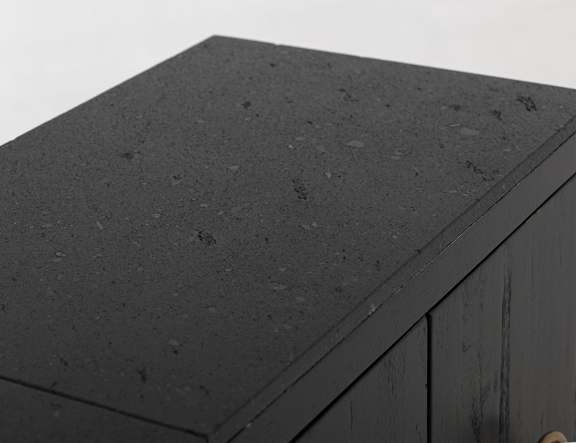 4 Door, Console. The Ebano Console, features a breathtaking top made from natural stone, ethically sourced from a quarry. This stunning piece brings an air of elegant sophistication to any room. Its metal base provides reliable support and creates a striking contrast with the stone's organic texture. The custom metal pulls adorn the doors in a luxurious golden finish, enhancing the captivating black-and-gold contrast. The sleek black finish of the Ebano Console reflects a modern deco design and makes it a truly eye-catching addition to your decor. Using multiple species of wood in its construction showcases different grains, adding uniqueness. Transform your living area with this inspiring black furniture console that seamlessly combines functionality with aesthetic appeal.