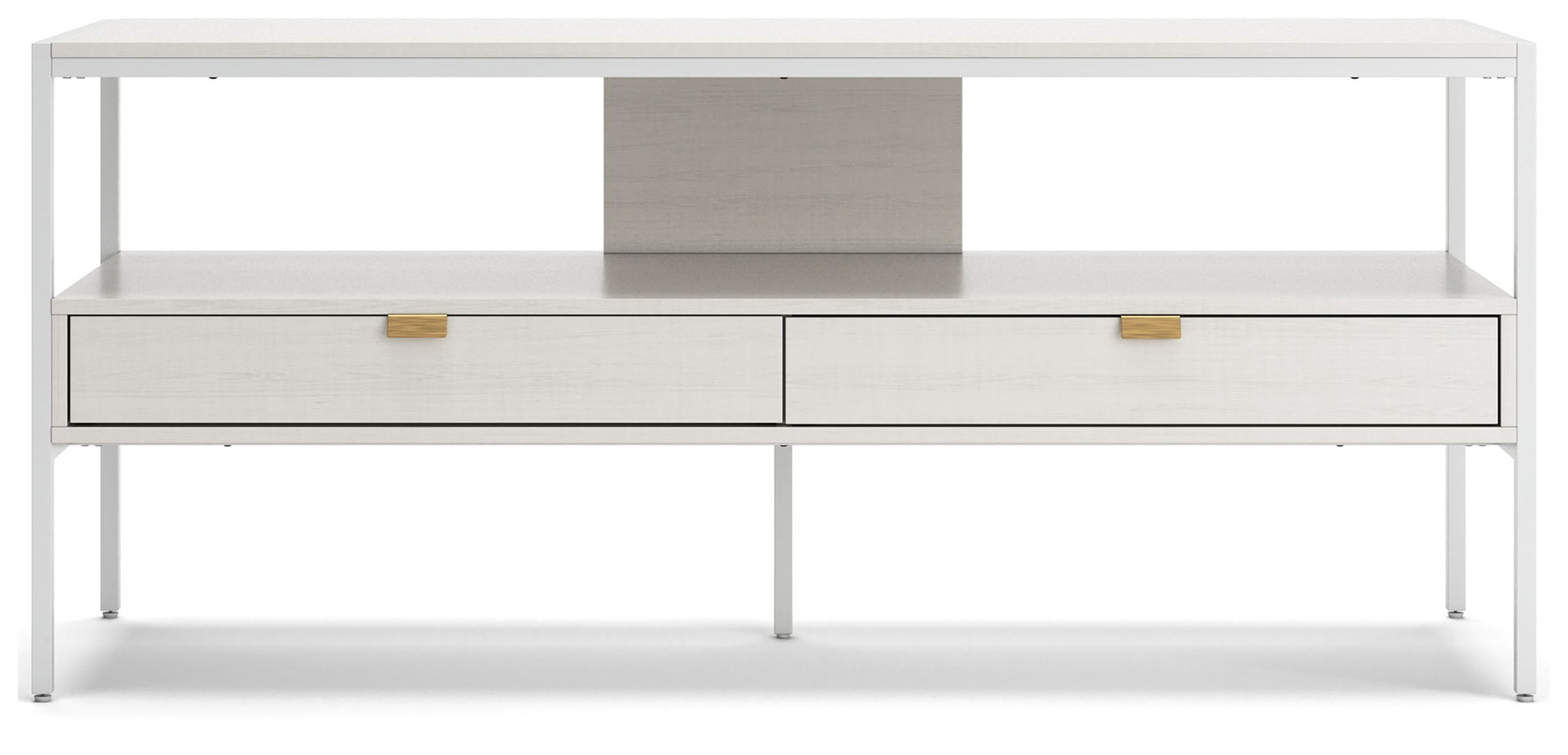 Bring your vision of a modern living room to life with this sleekly designed TV stand. Its linear construction and white finish keep things minimal. An open shelf and two drawers allow you to store in simply streamlined style, rounding out this versatile, striking piece.