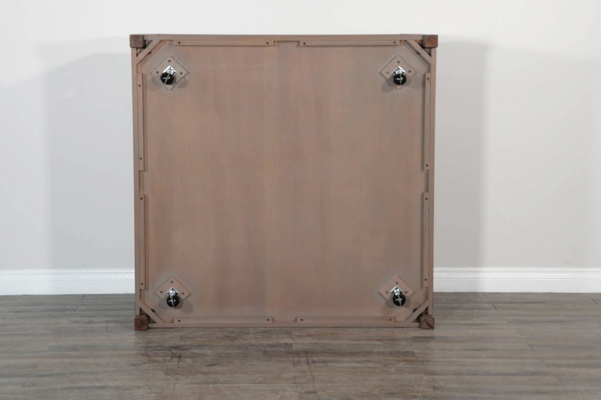 Made with distressed mahogany solids and veneers. This table is sleek, transitional-modern, and elegant, with a bold construction and enunciated design.