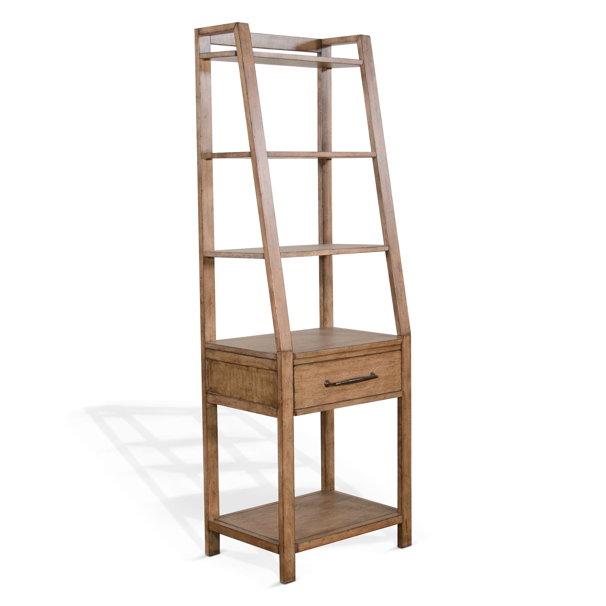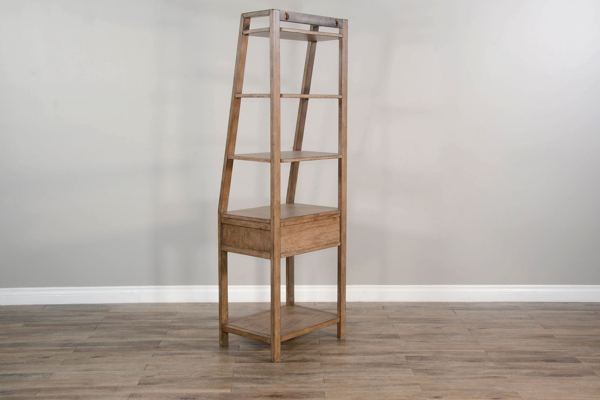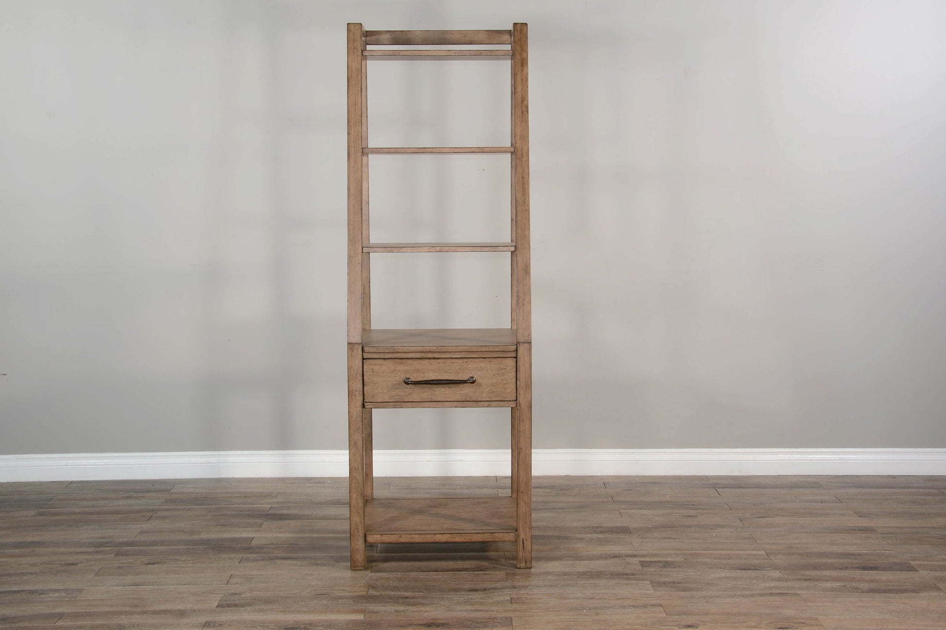 The transitional style of this entertainment pier will complement both traditional and modern designed living rooms. This beautiful taupe buckskin finish pier features drawers and open shelving space for all your storage needs.