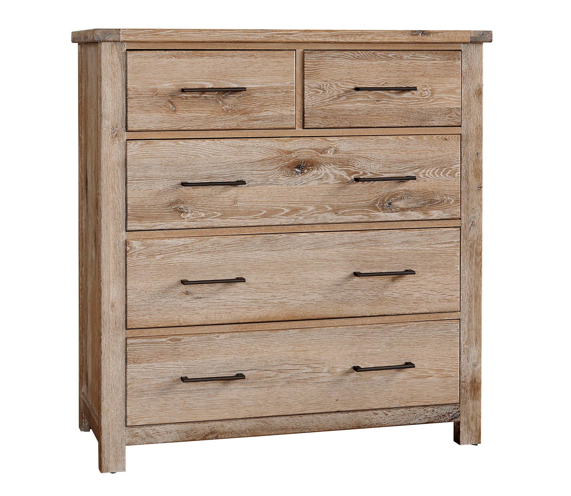 MADE IN USA - Vaughan Bassett - All produced and stocked in Galax, VA; by approximately 600 skilled craftsmen and craftswomen. Collection: Dovetail - This collection takes rustic furniture to the next level. It is produced from White Oak Solids and Solid White Oak Veneer. Vaughan Bassett has developed a process that allows them to accelerate how wood ages and thus gives a very natural reclaimed wood appearance. They have also incorporated a Dovetail joint; which joins the bed posts to the headboard and footboard as well as dresser, chest and nightstand tops. This versatile collection has two outstanding beds in both Queen and King sizes. The signature bed is the Dovetail bed with the fabulous 6 X 6 footboard. Four terrific finishes; Java, Mystic Gray, Sun Bleached White and Natural. Through an innovative program with the Virginia Department of Forestry, Vaughan Bassett replaces every tree used to produce its furniture. Over the last 10 or so years; 1.5 million trees have been planted.
