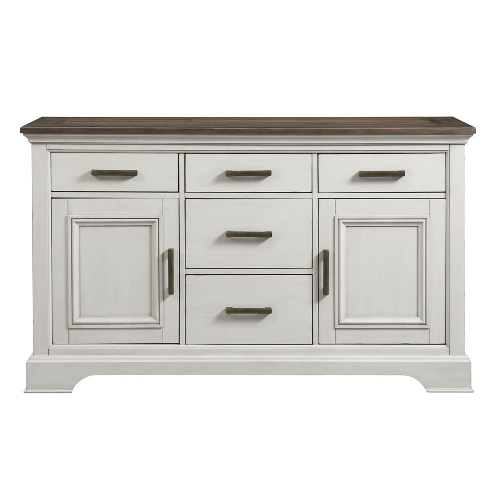 The Drake Dining Collection comes in a beautiful Two-Toned Rustic White and French Oak Finish. This unique collection also features an antique harp style base on tables, constructed from rustic knotty Oak Veneer and Select Hardwood.
