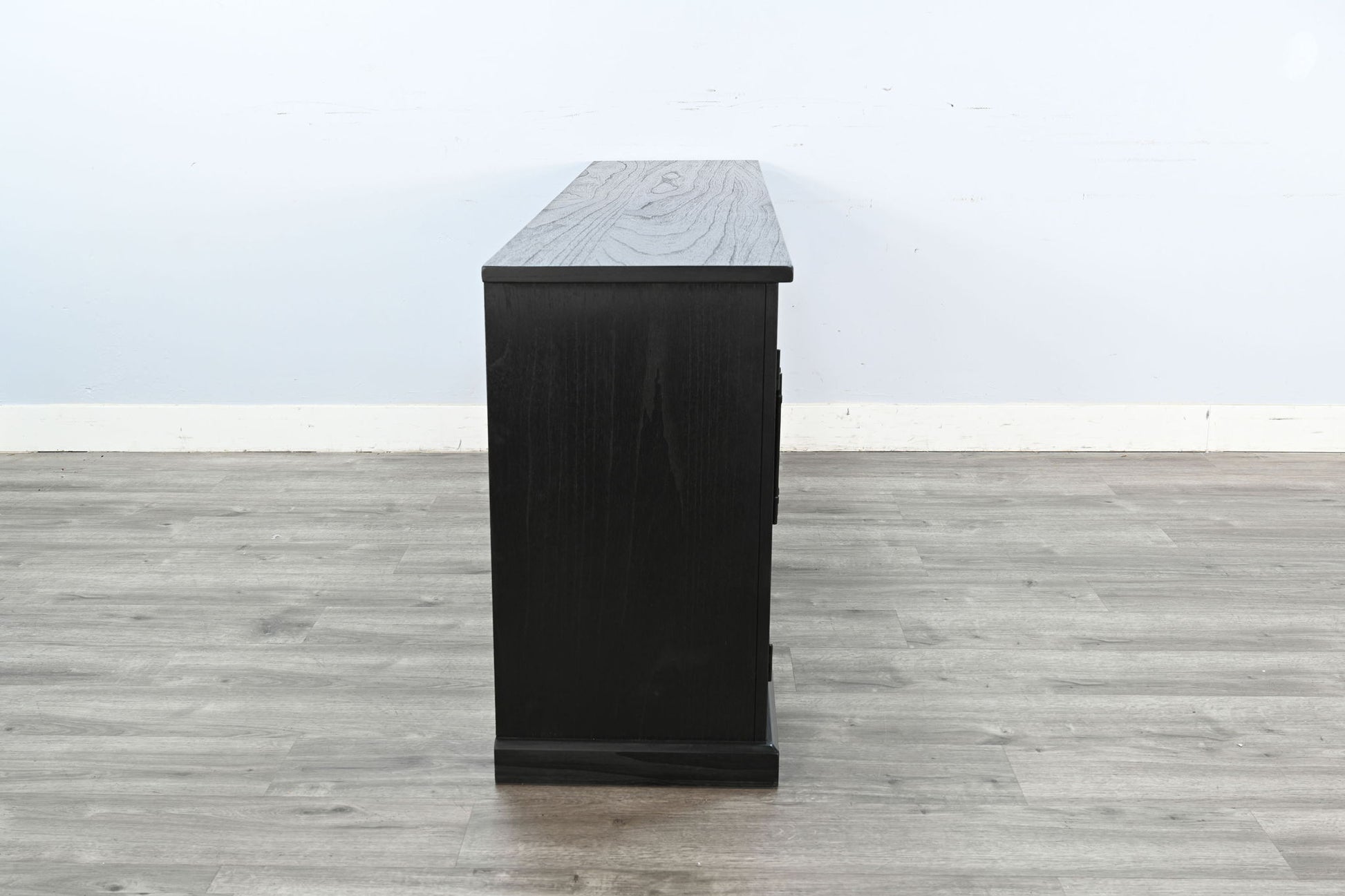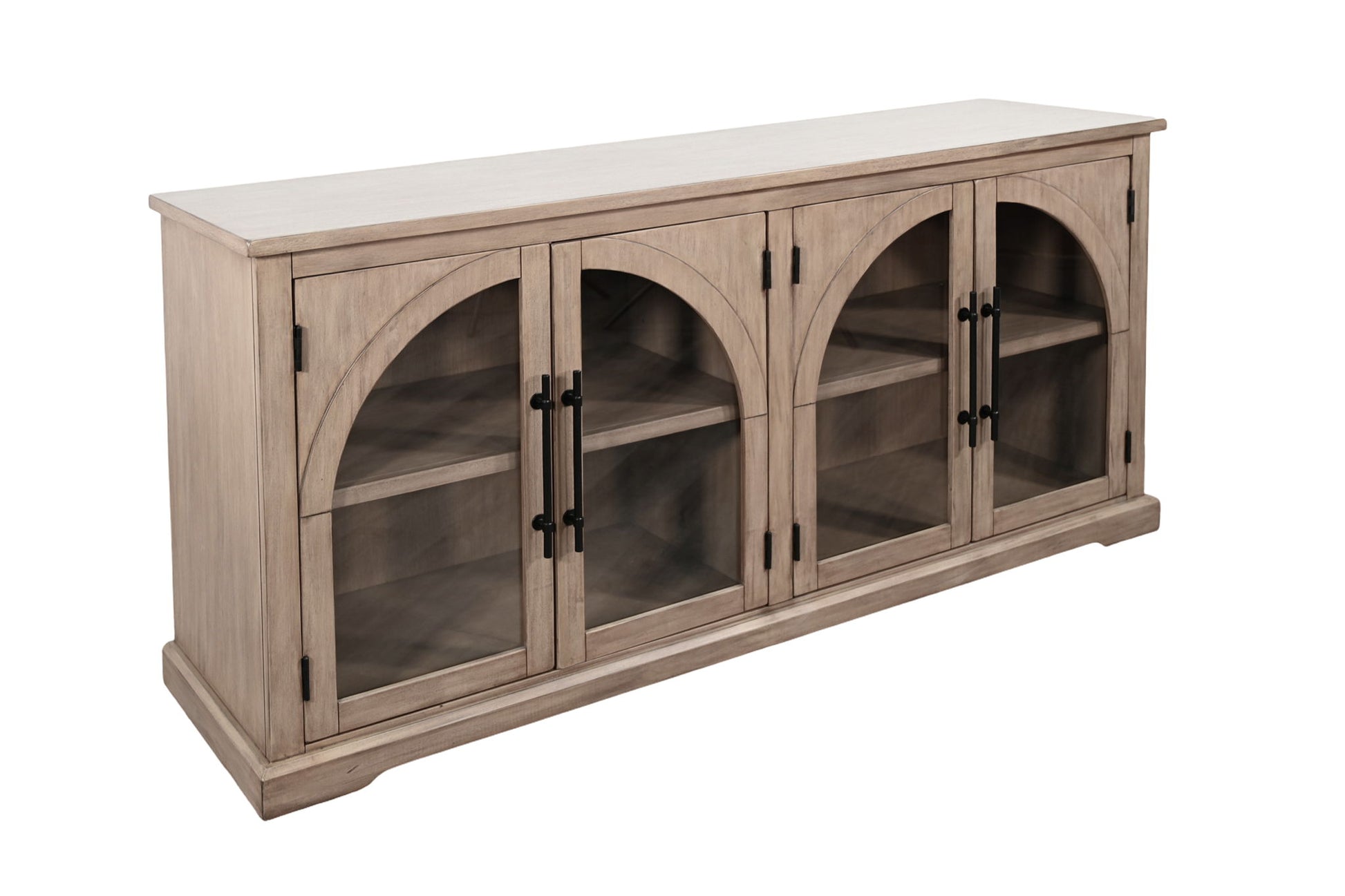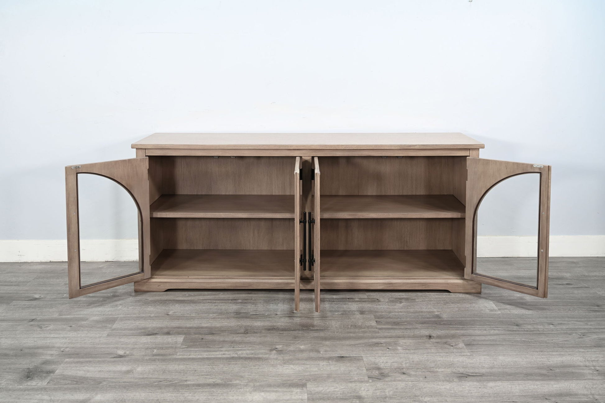 This sideboard blends clean-lined elegance with classic arch details. Its framed glass doors with arched molding create a distinctive display while allowing visibility to stored items. A finish paired with light interior shelving adds a refined contrast, making this a standout piece for dining rooms, living spaces, or entryways.