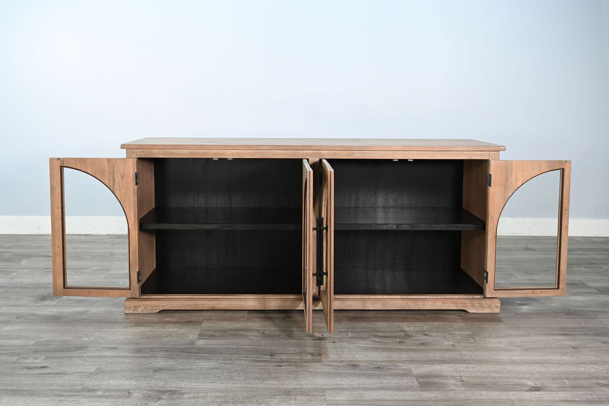 This 4-door sideboard blends clean-lined elegance with classic arch details. Its framed glass doors with arched molding create a distinctive display while allowing visibility to stored items. A warm natural wood finish paired with black interior shelving adds a refined contrast, making this a standout piece for dining rooms, living spaces, or entryways.