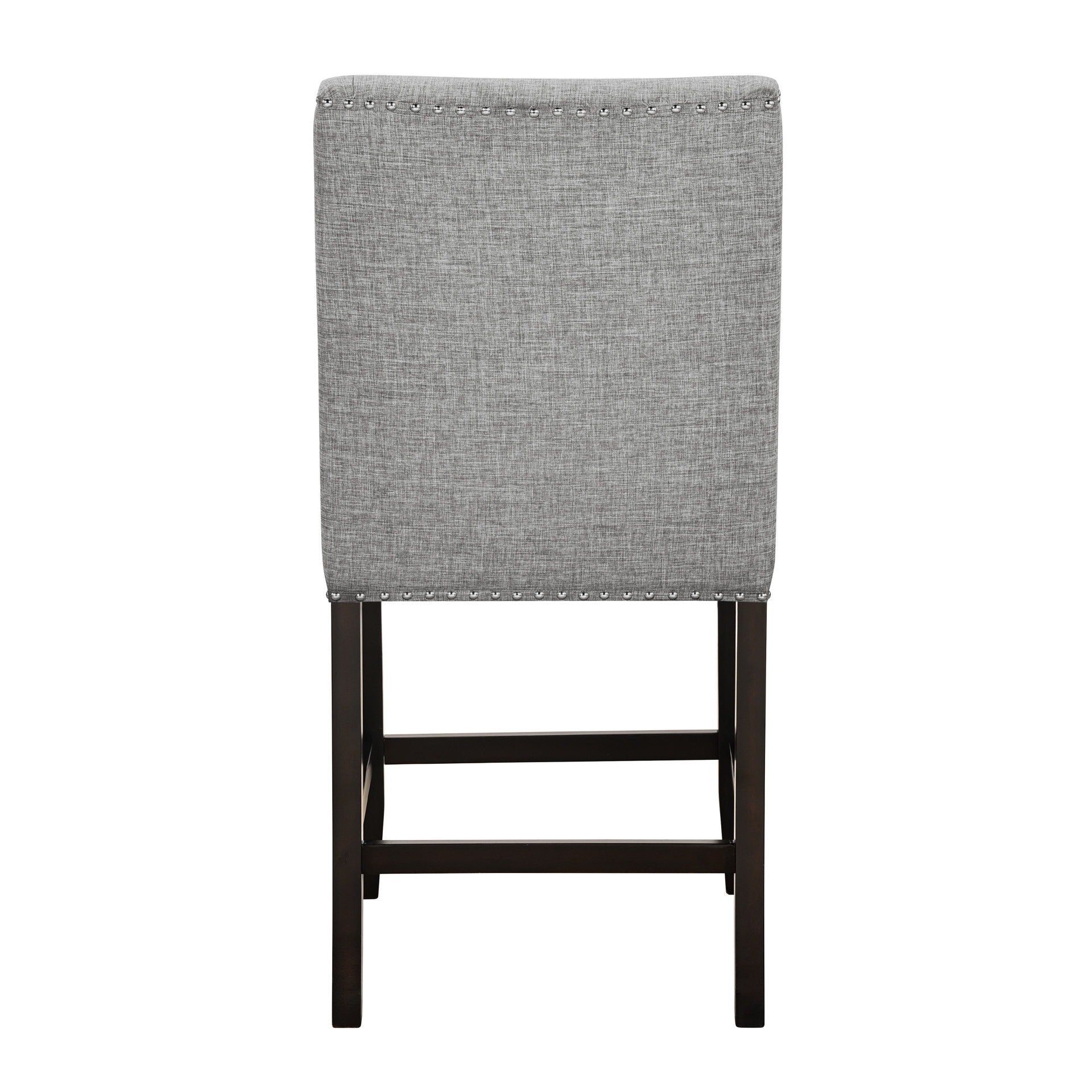 The Faust Upholstered Parsons Counter Dining Chairs offer a blend of luxury and durability, making them an excellent addition to any dining space. This set includes two Parsons counter chairs, each crafted from solid rubberwood and eco-friendly manufactured woods to ensure strength and durability. The solid wood legs and base stretchers provide extra stability, making these chairs a reliable choice. The 100% polyester tweed fabric fully upholsters the chairs, offering a soft, comfortable, and easy-to-clean surface. Featuring a sleek, contemporary design, the chairs are enhanced with decorative nailhead trim along the edges, adding a touch of elegance and sophistication. The dark wooden legs create a striking contrast to the light gray upholstery, resulting in a balanced and modern aesthetic. Ideal for those seeking a combination of style, comfort, and durability, the Faust Parsons Counter Dining Chairs are perfect for elevating your dining area.