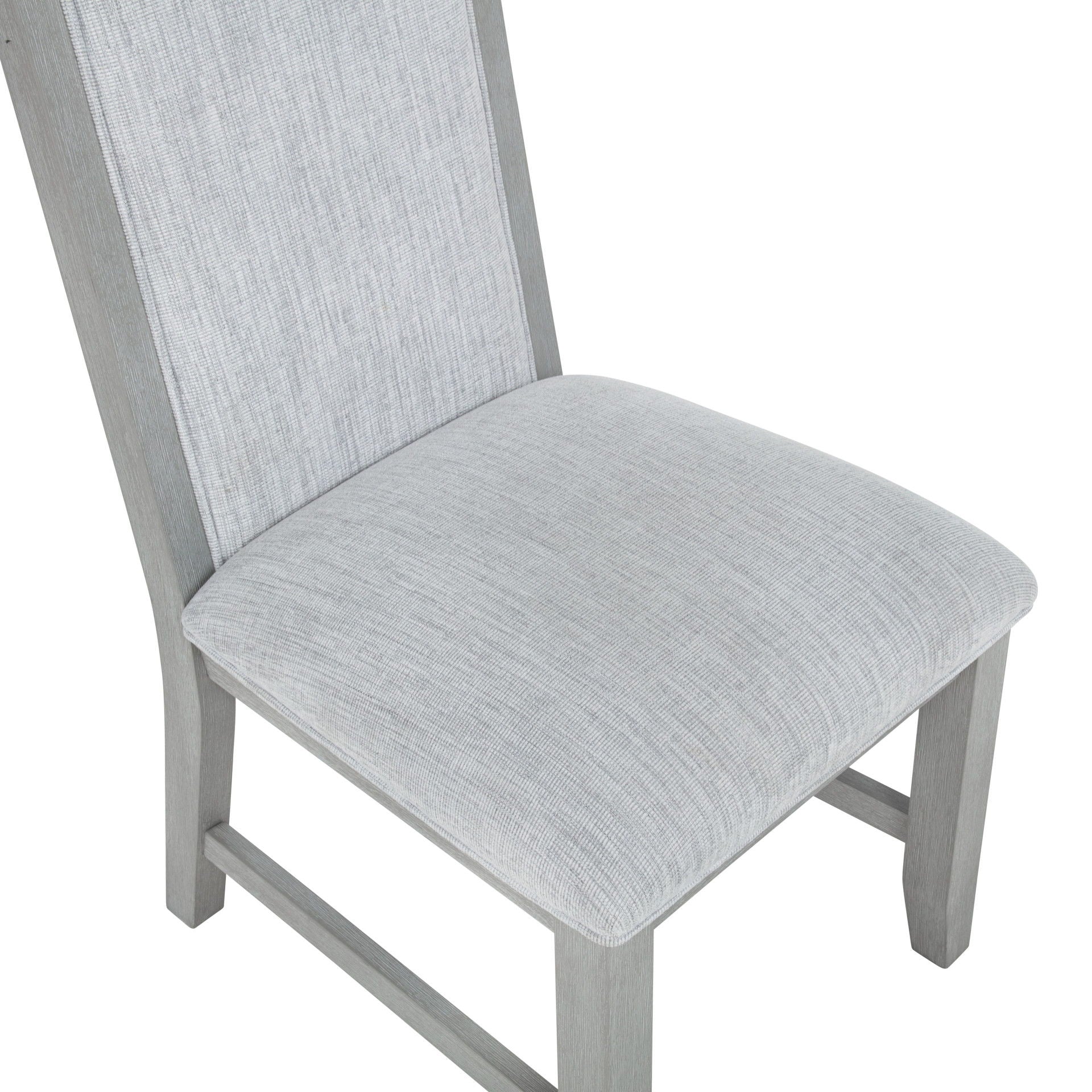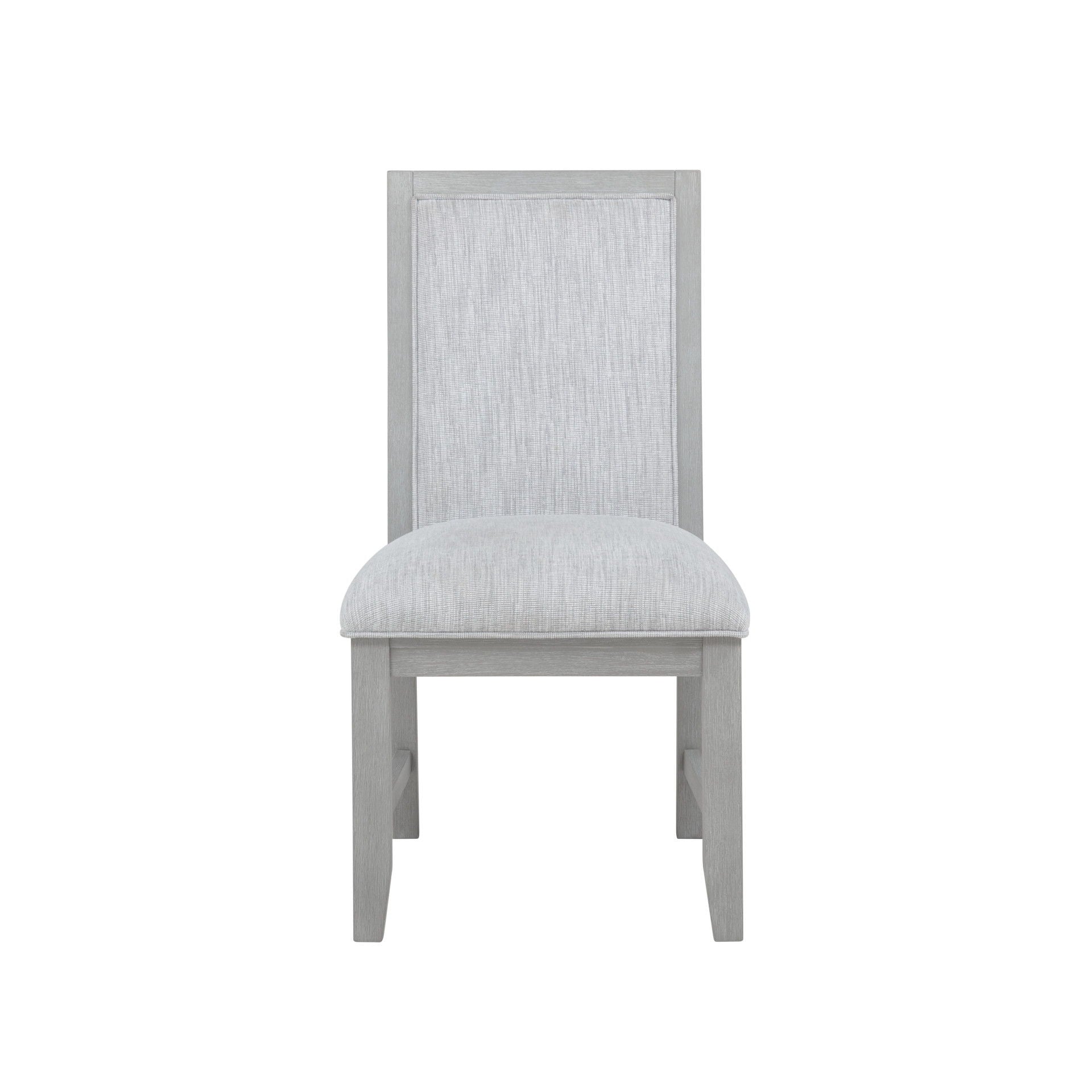 The Fiona Dining Side Chair, sold as a set of 2, blends style, comfort, and durability. Crafted from solid Rubberwood, engineered wood, and eco-friendly oak-embossed laminate, it features a Misty Gray finish that highlights the natural grain. The high backrest and plush, easy-care fabric provide excellent support and comfort for extended dining. With clean lines and a refined silhouette, this chair adds timeless charm to any dining room.