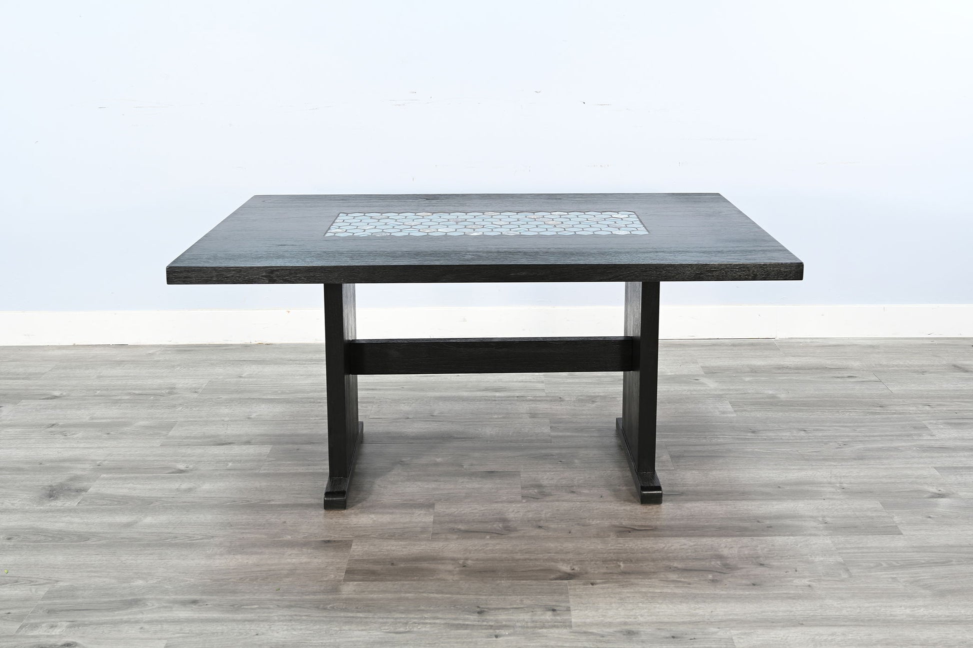 This stunning dining table combines the sleek elegance of black wire-brushed mindi solids and veneers with practical functionality. Its honeycomb tile insert serves as a heat-resistant surface, perfect for placing hot plates and dishes without worry. The table's black finish exudes a modern sophistication while the wire-brushed texture enhances the natural grain of the mindi wood, adding depth and character to its appearance.