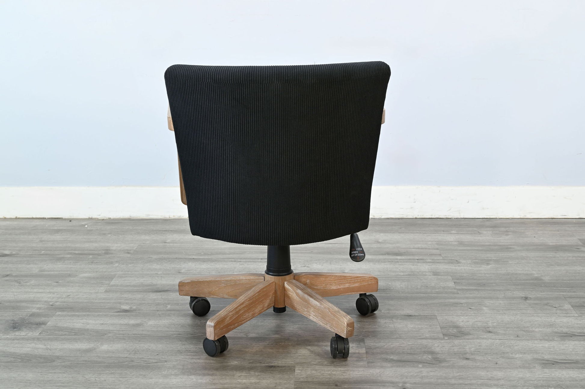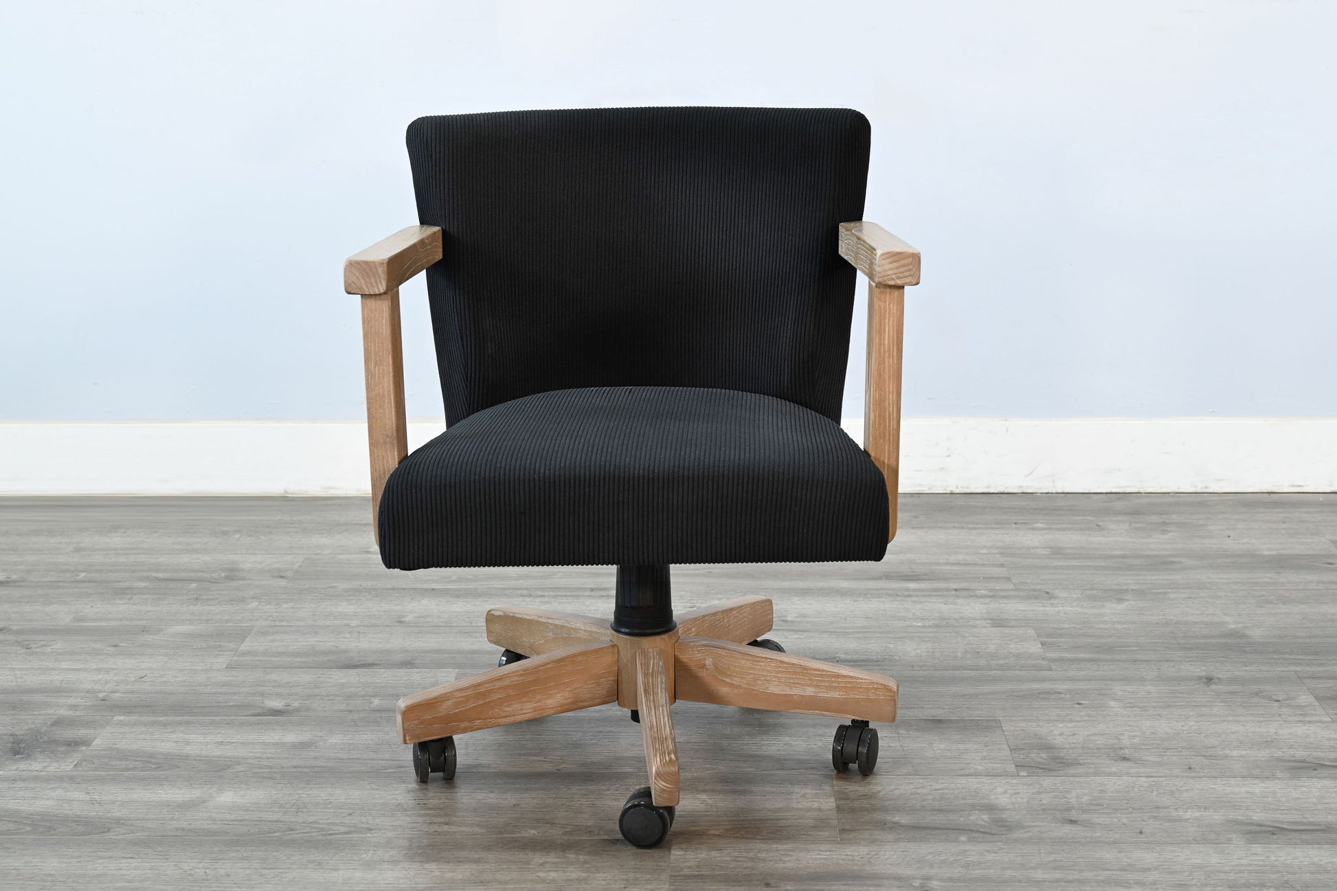 Bring comfort and character to your workspace with this Corded Swivel Office Chair, featuring a perfect blend of modern utility and rustic charm. Upholstered in a textured black corduroy-style fabric, the seat and backrest offer plush support with a refined feel. The lightly washed oak arms and base add a warm, natural contrast while maintaining durability and style. Complete with smooth-rolling casters and an adjustable seat height, this chair is designed to support your productivity in comfort and style.