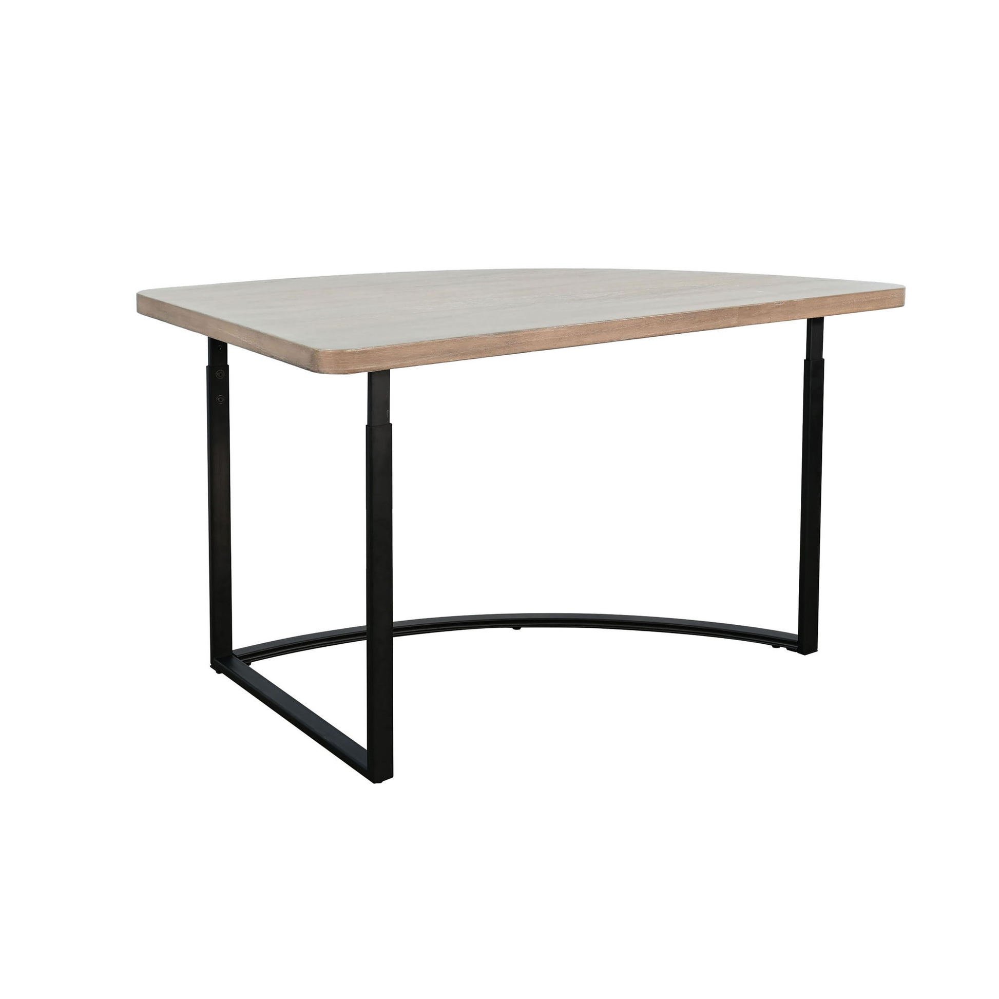 Upgrade your living space with this sleek, versatile, and height-adjustable corner table. Designed with a modern aesthetic, it features a triangular wooden top with a warm, natural finish and a sturdy black metal frame. The adjustable-height feature allows you to customize the table for various uses, whether as a dining surface, laptop desk, or casual workspace. Its curved base offers both stability and architectural flair, making it perfect for small spaces and contemporary interiors.