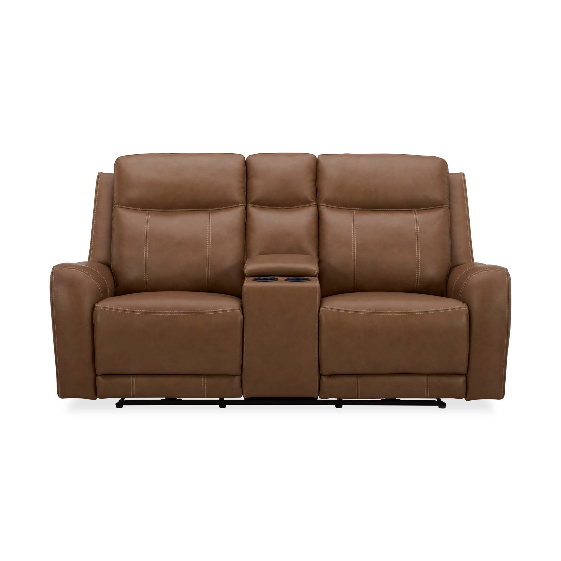Covered in rich Butternut leather with a custom match, the Haywood Power Console Loveseat offers the ultra comfortable feel of classic motion upholstery with updated modern touches. Bold padded contoured arms add an element of softness while the contrasting decorative stitching adds to the visual appeal. Looking for creature comforts? The easy-to-use switch includes USB charging for all your devices, and the console offers additional USB/USB-C charging and dual cup holders for added convenience. Haywood's independently operating power headrests ensure that you'll have proper neck support, no matter how you choose to relax.