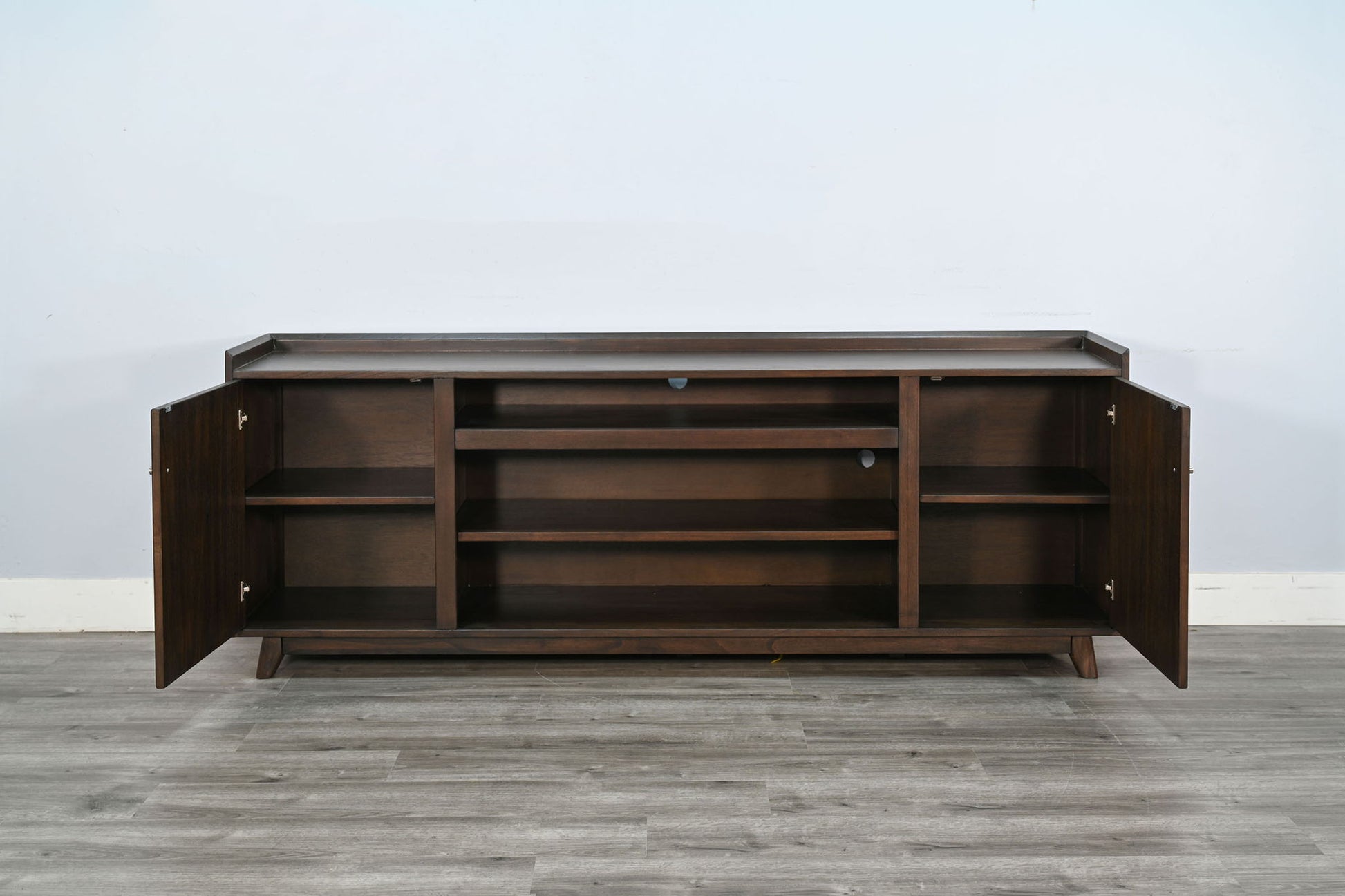 Streamline your media setup with this stylish and functional 86-inch TV stand. Crafted in a warm wood finish with clean mid-century lines, it features two side cabinets with adjustable shelves and a central open shelving section for consoles, decor, or sound equipment. Cord management cutouts make it easy to keep cables organized and out of sight. The raised lip around the top adds subtle detail while helping keep items secure. Perfect for living rooms or media spaces needing a sleek, spacious solution.