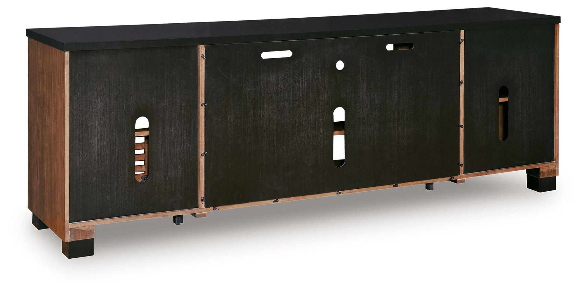Double down on casual chic with the two-tone look of this TV stand. Its warm finishes reflect your eye for modern design. The trend-right slatted styling brings added charm. And with handy cabinets, shelving and cord management holes, keeping entertainment consoles and accessories organized is a breeze. Enhancing the experience, the fireplace insert brings a touch of warmth and beautiful ambiance to your living room. With the touch of a button, adjust the temperature and the flame brightness, and connect your device to the built-in wireless speakers. The flame effect includes a realistic-looking log set with glowing embers, along with an ambient down light.