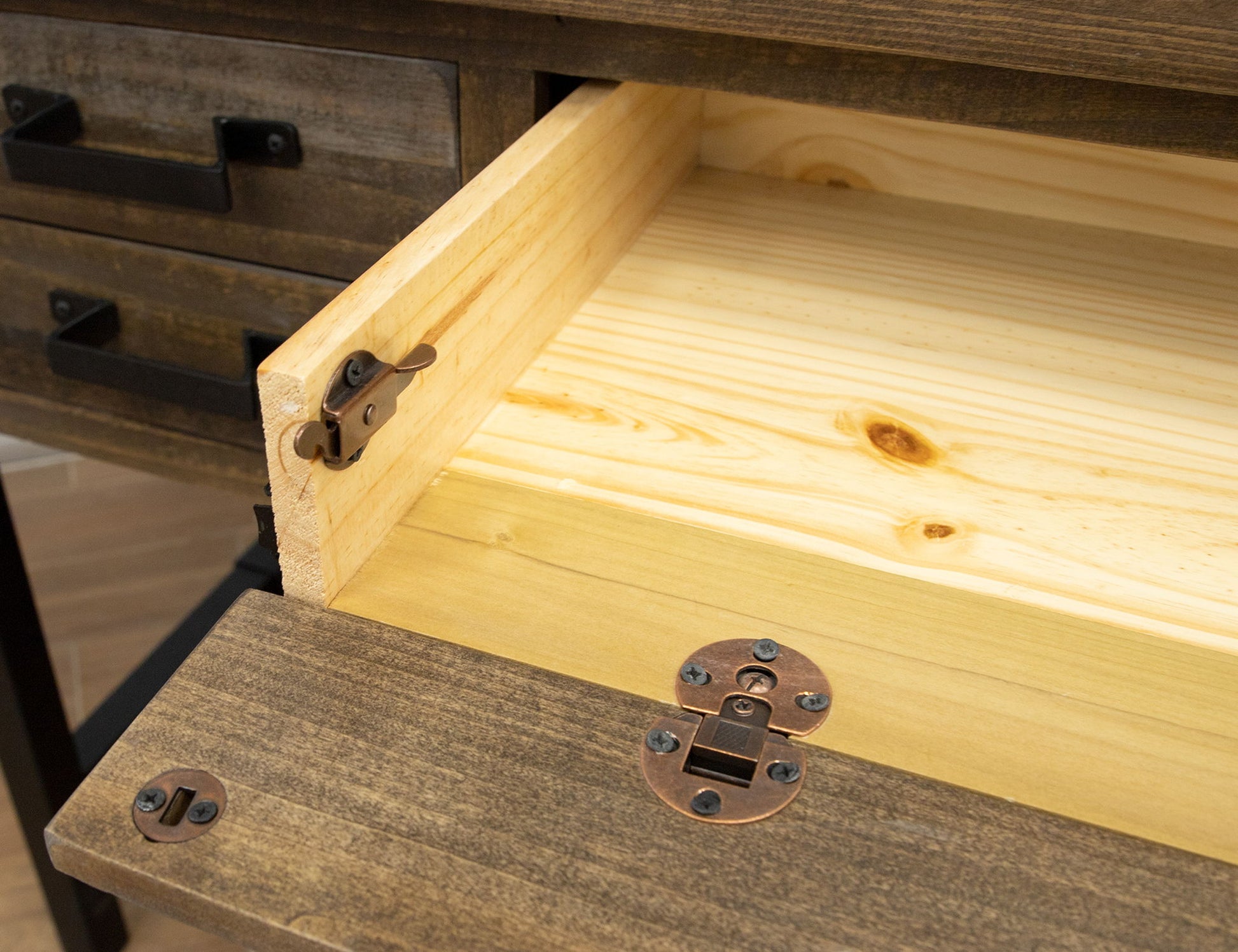 5 Drawer Desk. The Loft Brown Collection is constructed using pine wood that has been hand-stained and distressed, complemented by hand-forged iron hardware. This beautiful collection features a wide range of high and low finish colors, making it a striking addition to any room décor you choose to design.