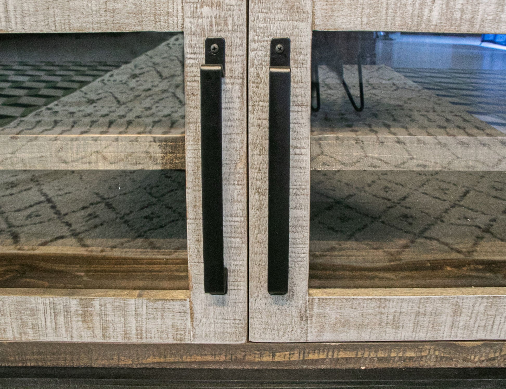 2 Door 93" TV Stand. The Loft Brown Collection is constructed using pine wood that has been hand-stained and distressed, complemented by hand-forged iron hardware. This beautiful collection features a wide range of high and low finish colors, making it a striking addition to any room décor you choose to design.