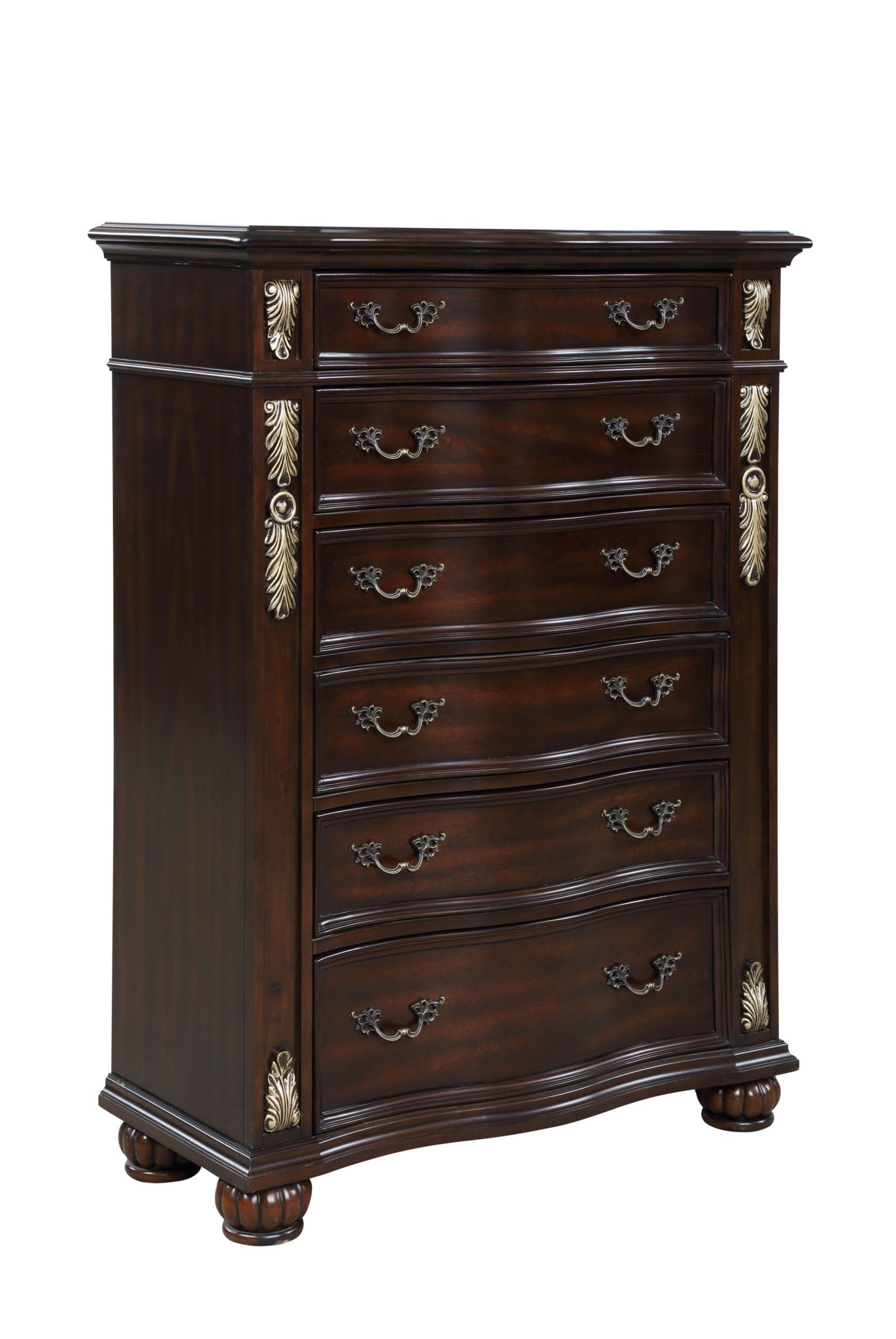 The Royal Classics Maximus 6-Drawer Chest in Madeira Brown is a masterfully crafted piece that blends enduring quality with timeless elegance. Constructed from solid poplar and premium birch veneers, this chest is built to last, offering heirloom-quality durability and beauty for years to come. The multi-step finish enhances the rich, natural grain of the wood, while delicately burnished gold tipping highlights the intricate Baroque-inspired carvings, adding a luxurious touch to the overall design. Each drawer is crafted with French and English dovetail joinery for exceptional strength and glides smoothly on full-extension tracks, providing effortless access to your belongings. The impeccably finished interiors ensure snag-free storage, while the velvet-lined top drawers add a layer of refined sophistication. This chest combines classic design with modern functionality, making it a perfect addition to any elegant bedroom.