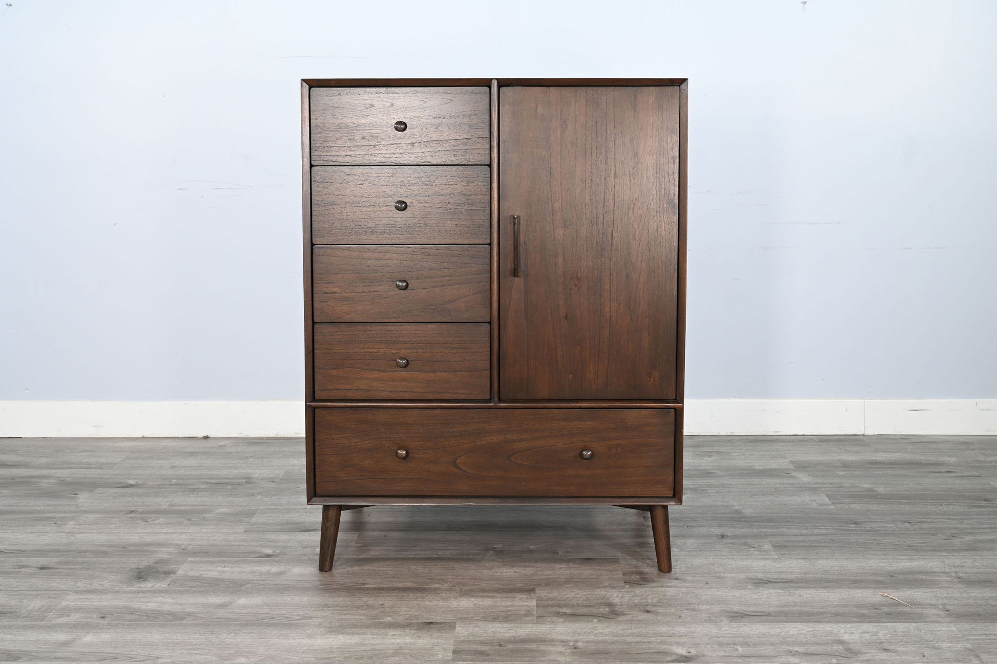 Bring timeless elegance and practical storage to your bedroom with this Mid-Century Modern Tall Dresser. Featuring a warm walnut finish, clean lines, and angled legs, this piece blends vintage charm with modern utility. It includes five spacious drawers and a sleek cabinet door, providing versatile storage for clothing, linens, and accessories while enhancing your décor with classic style.