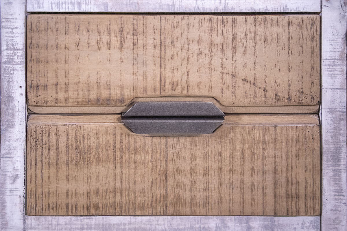 2 Drawer End Table. Drawing inspiration from transitional design, the Mita collection seamlessly blends metal and wood elements. This exquisite collection is meticulously crafted from sustainable mango wood, skillfully hand-distressed to achieve a captivating finish.