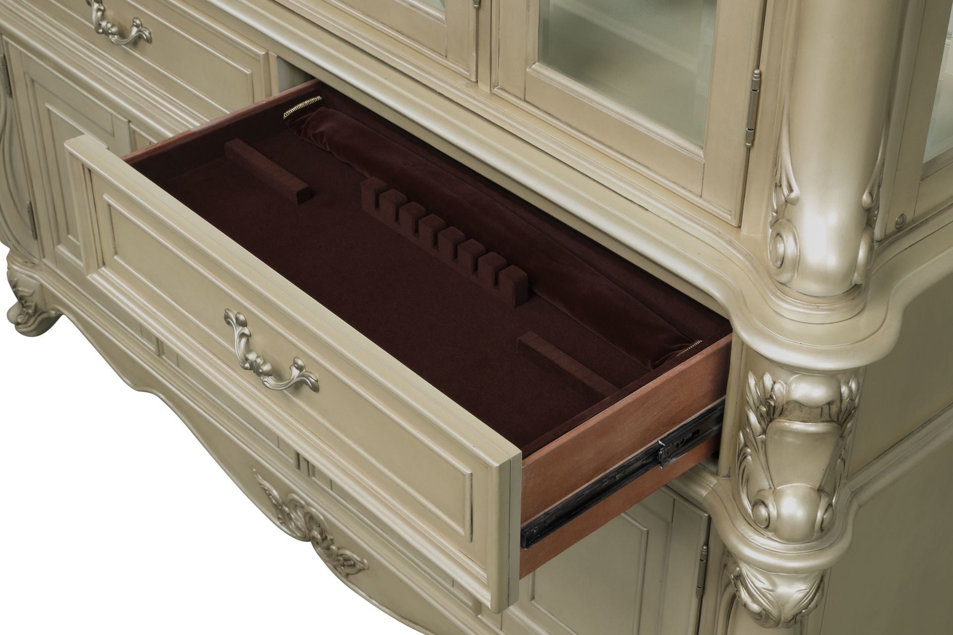 The Monique China Buffet in Champagne is a perfect blend of timeless elegance and robust craftsmanship. This exquisite piece is crafted from poplar solids and birch veneers, ensuring exceptional strength and durability. Reflecting the opulence of classic Baroque furniture, the buffet features intricate detailing and ornate carvings that embody a sense of grandeur. Its elegant curved lines and elaborate design elements enhance its sophisticated look, making it a striking centerpiece for any dining room. The multi-step champagne finish, meticulously applied, highlights the natural beauty of the wood, while antique gold glazing accentuates the intricate moldings and carvings. Inside, quality craftsmanship continues with two drawers featuring dovetail joinery, full extension glides, and velvet lining to protect your silver serving pieces. Thoughtful extras include a removable silverware caddy, making table setting more convenient. Add the Monique China Buffet to your dining space and experience unparalleled elegance and functionality.