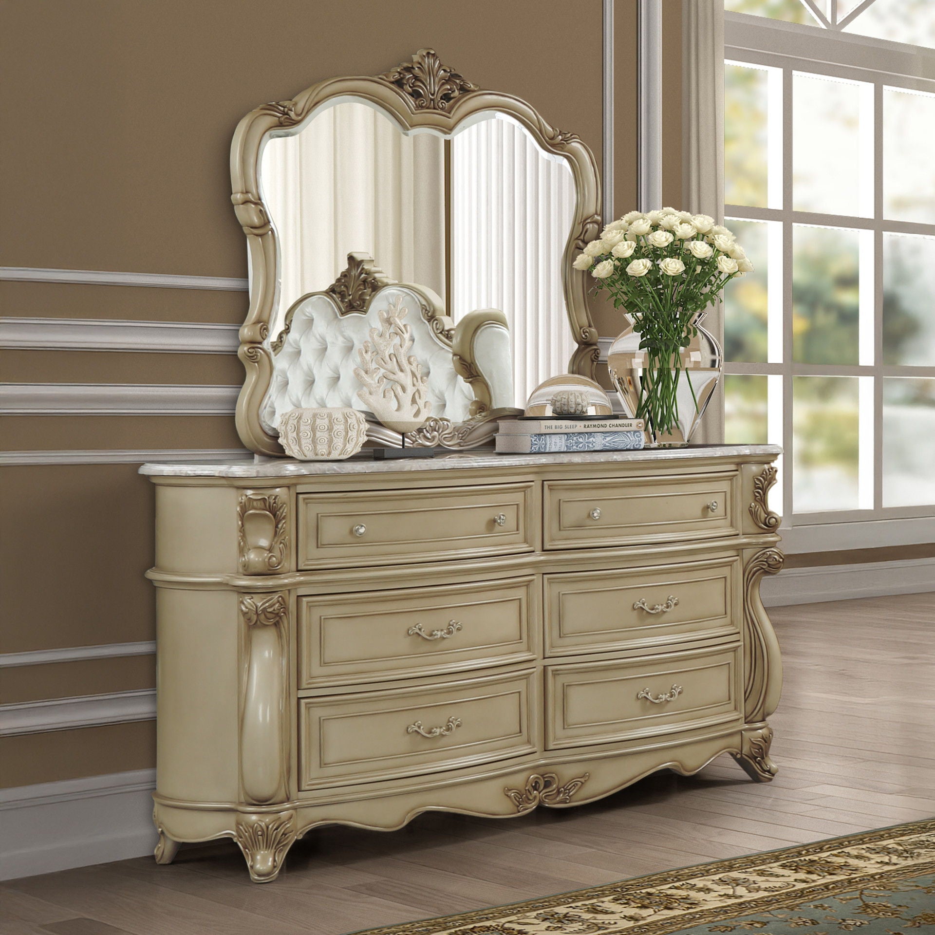 - Exquisite Finish: The intricate, multi-step champagne finish is painstakingly applied to enhance the natural beauty of the wood. Antique gold glazing highlights the moldings and ornamental carvings.