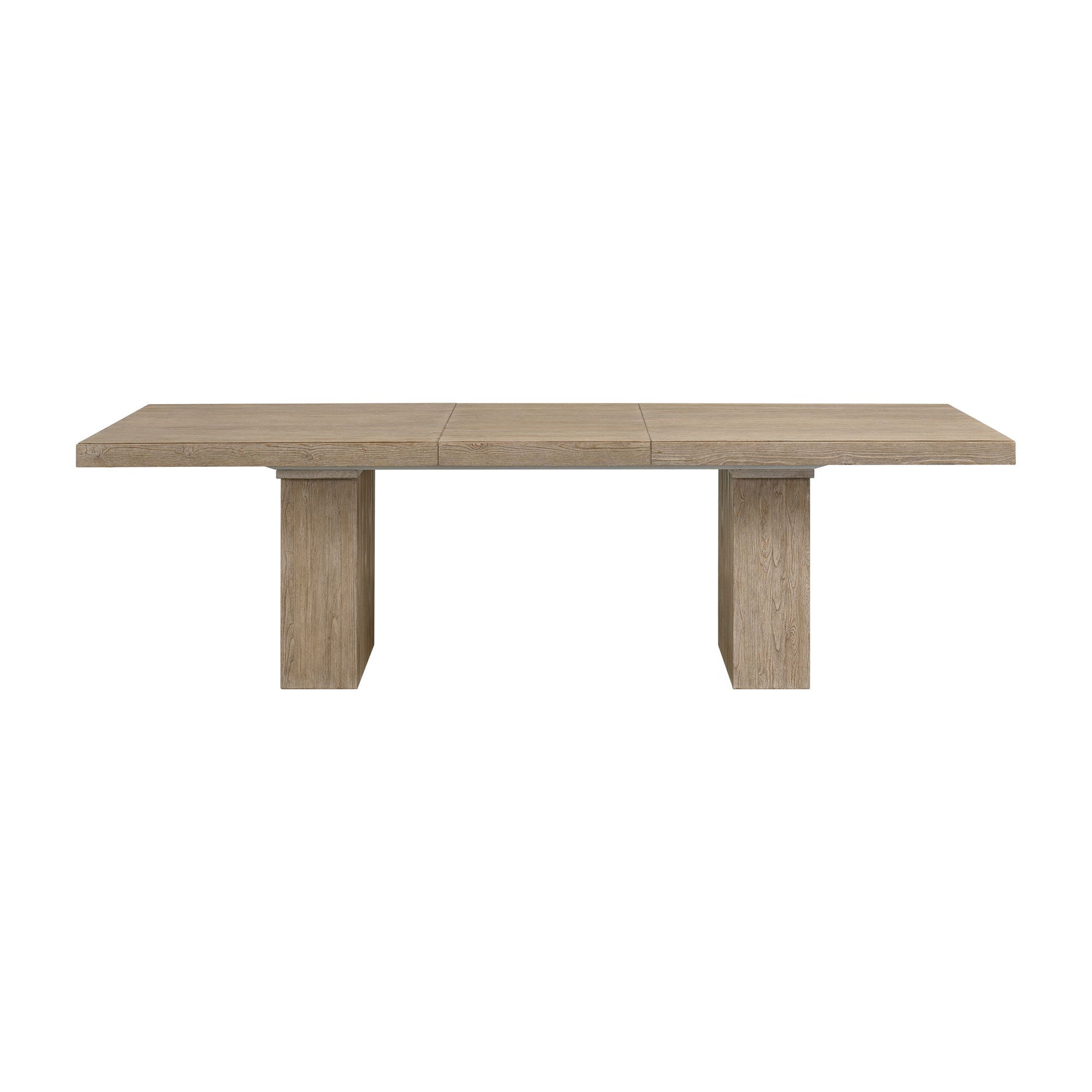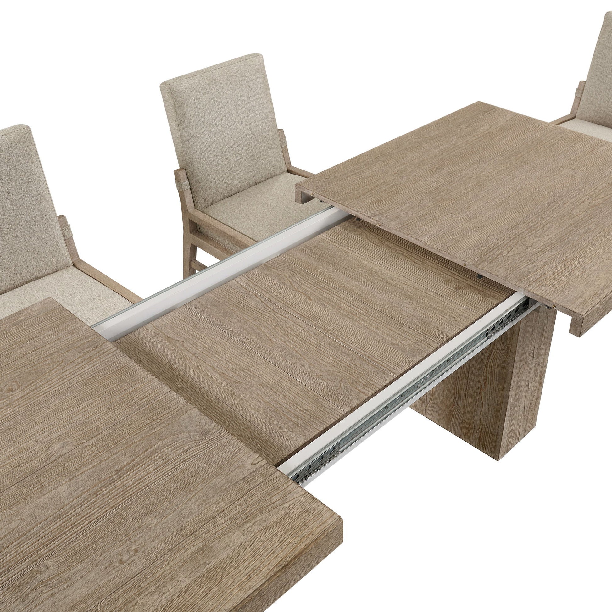 This sturdy dining group features clean, modern design elements blended with the casual nature of lightly wire brushed pine solids and veneer. Shown in a beautiful Weathered Sand finish. The cast bar pull hardware on the Sideboard has an antique pewter finish.