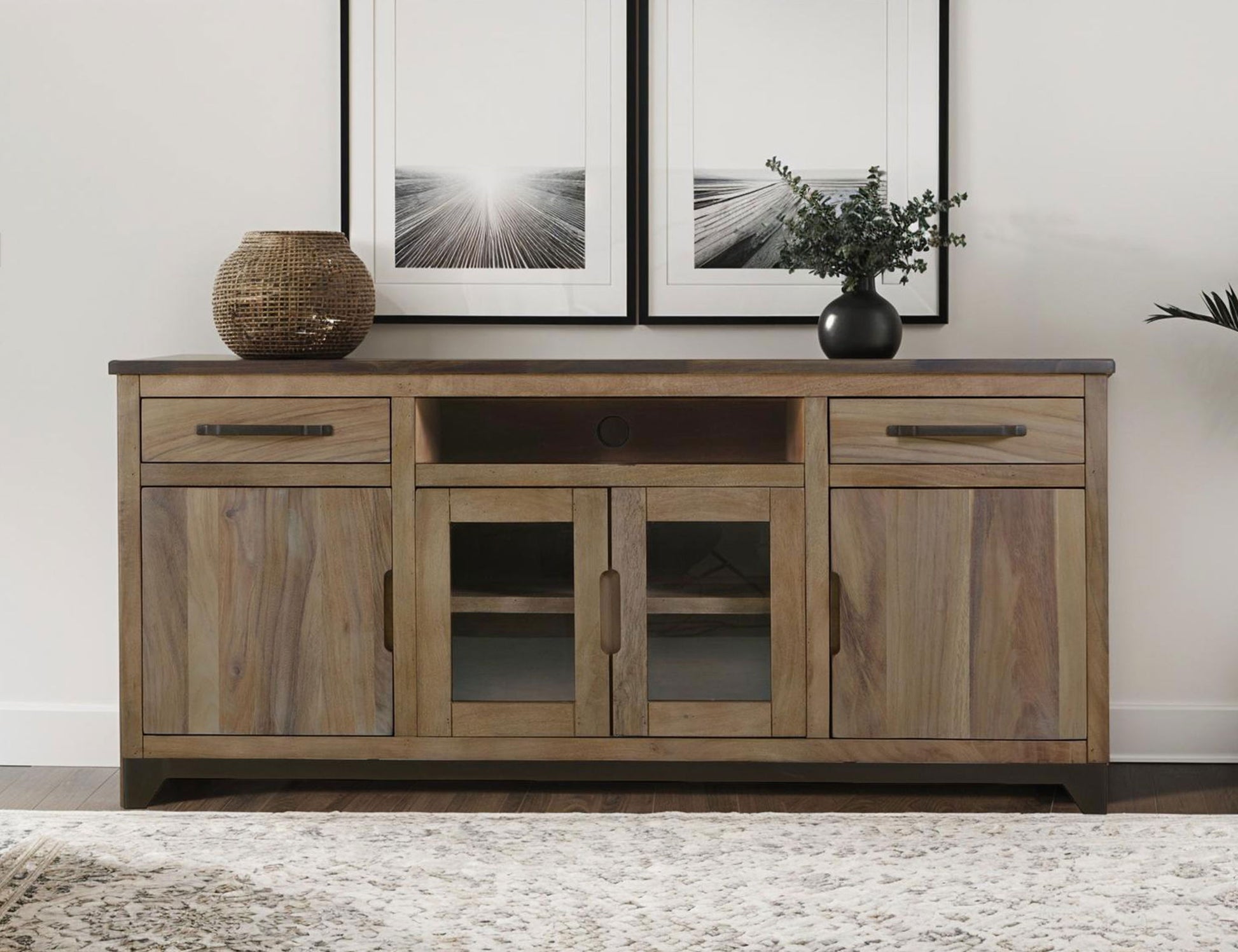 2 Drawer, 2 Door, 2 Glass Door, Stand 70". The Natural Parota Stand is an elegant 70-inch piece that skillfully combines design with robust craftsmanship. It is constructed from melina and mango wood and features a stunning brown top finish and natural tone enhanced by a translucent multi-step lacquer that showcases the natural wood grain. This stand is equipped with a central fixed shelf, two wooden doors, and two glass doors, all of which have magnetic catches. It provides ample space for your media essentials and decorative items, making it an ideal addition to any living room or bedroom. Additionally, the stand includes an integrated wire management system on the back panel for a clean and organized appearance. The hand-cut and welded iron base is powder-coated for enhanced durability and protection against corrosion.