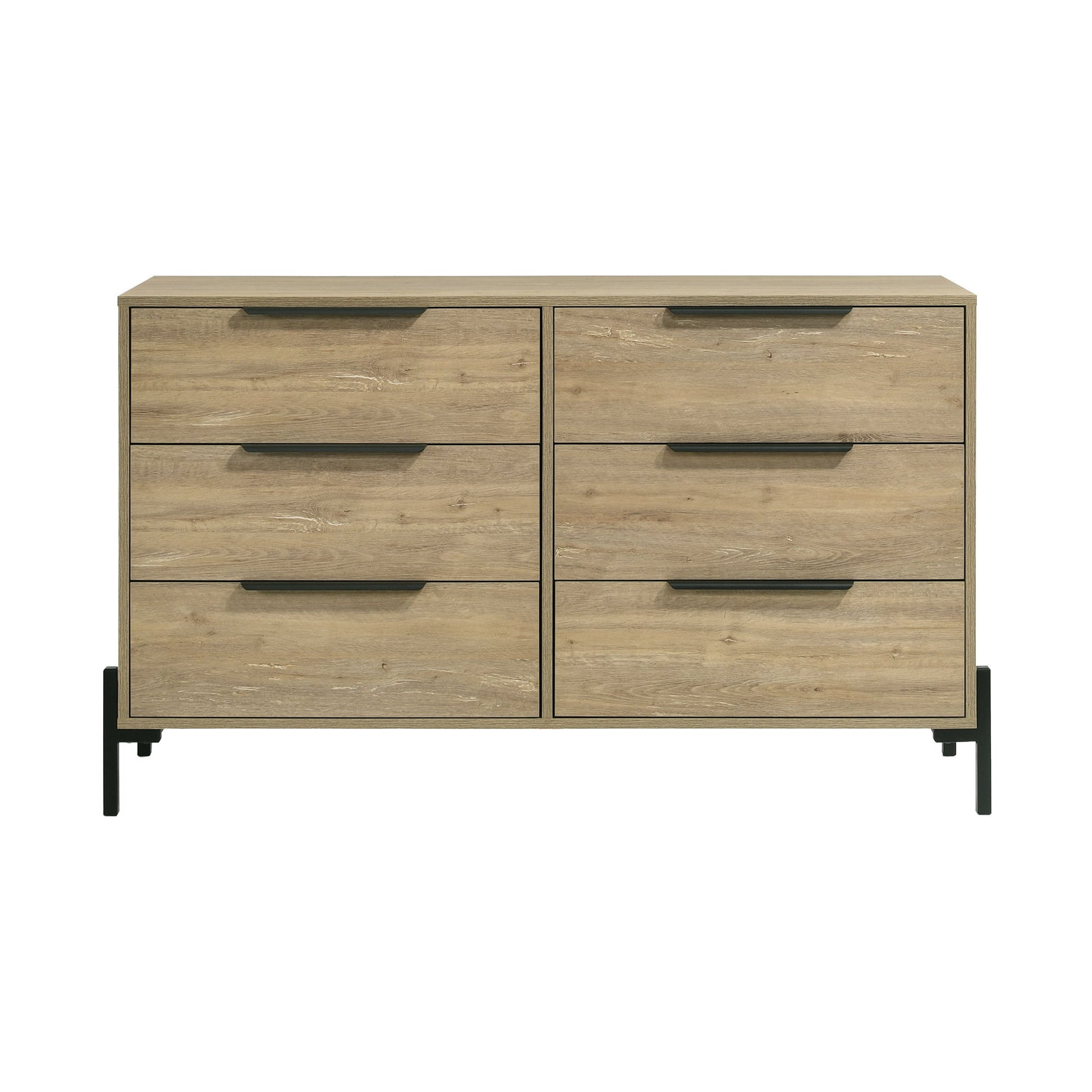 The modern Newhall melamine bedroom group features a perfect balance of clean lines, chic styling and practicality. The group features a light vintage oak melamine with metal legs and wide drawer pulls with a dark burnished black finish.